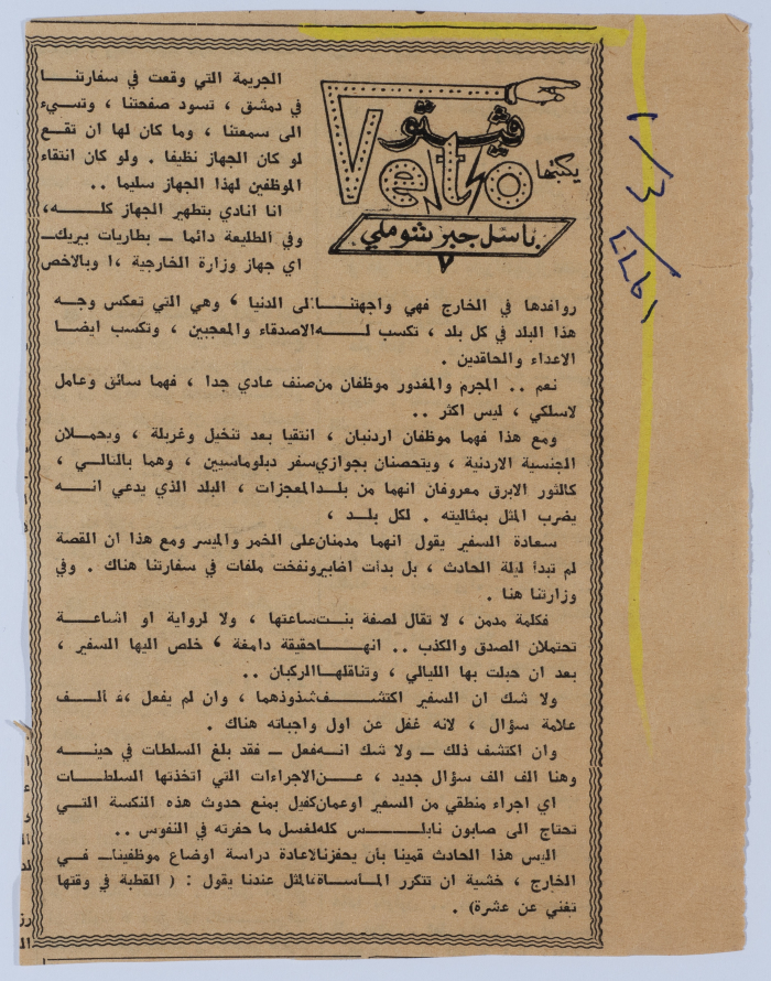 Issued on 1 April 1966, this document shows a clipping from Palestine Newspaper, which includes an article written by Basel Jabr Shomali in the Veto Column.