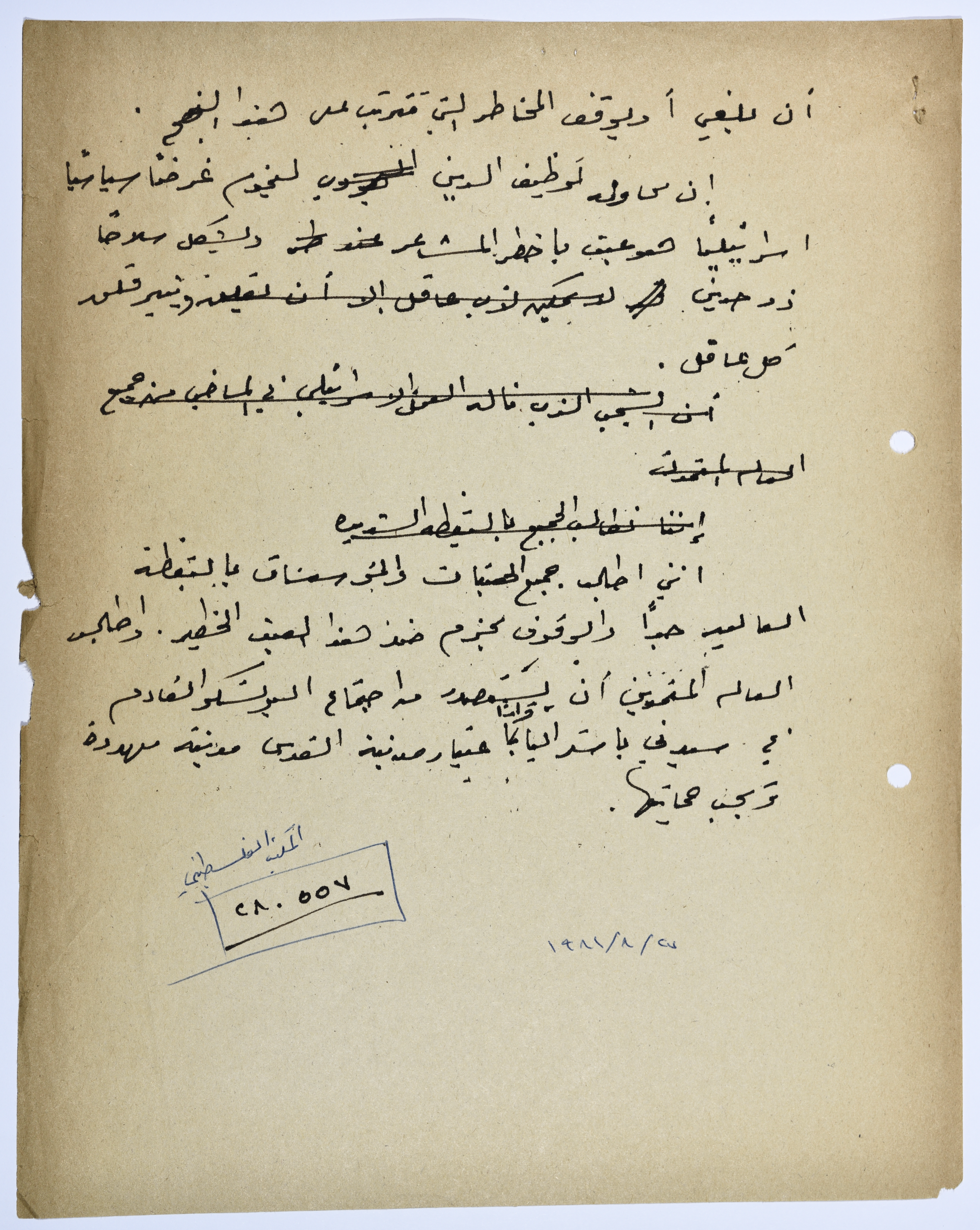 A handwritten document in Arabic penned by Ibrahim ad-Daqqaq in 1981 to document a number of attacks on al-Aqsa Mosque and other holy sites. Ad-Daqaq calls for action to put an end to these violations as well.