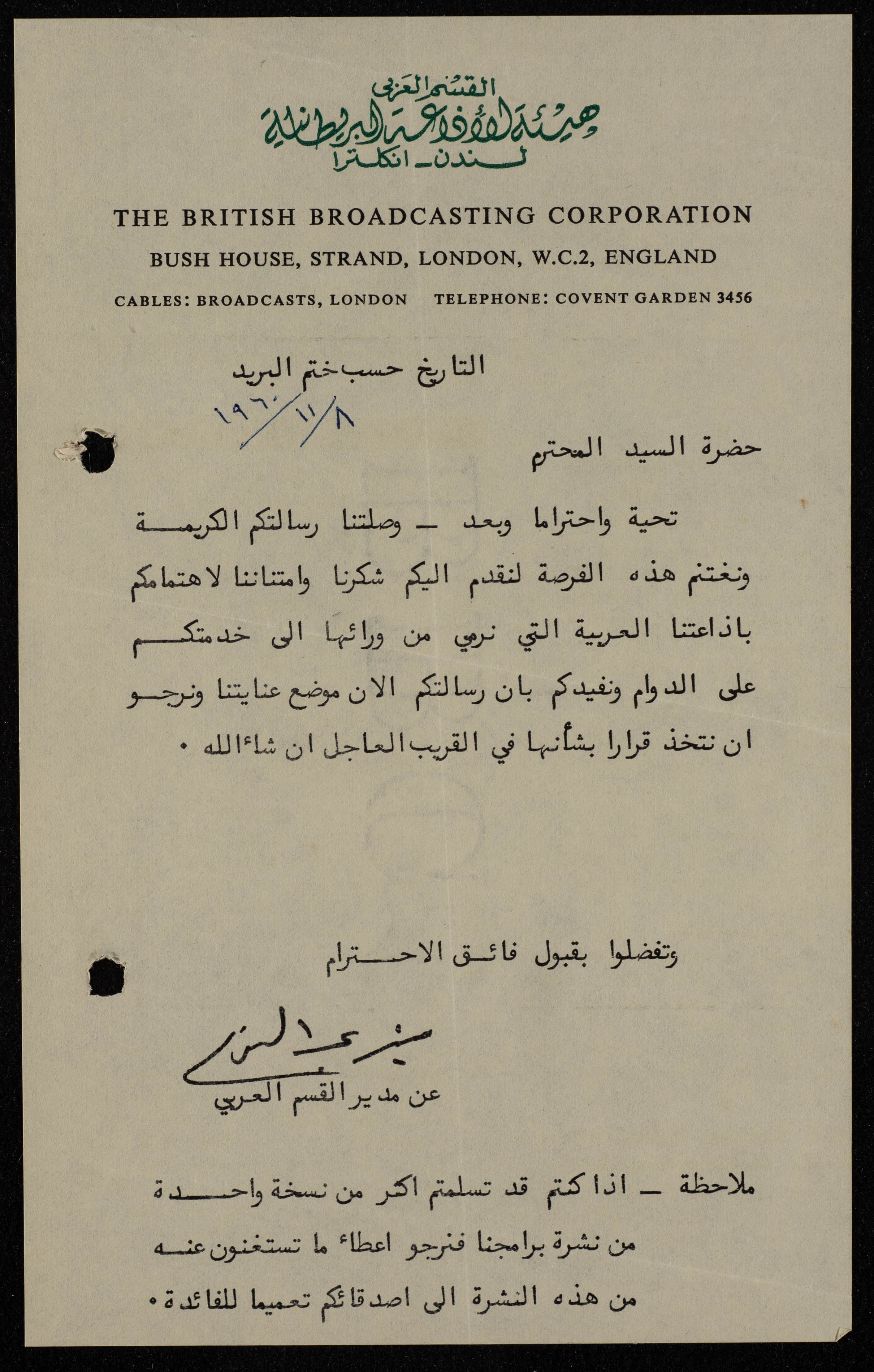 A formal letter of thanks by the British Broadcasting Corporation (BBC Arabic) to Ilyas Kusa on 8 November 1960 for his letter.