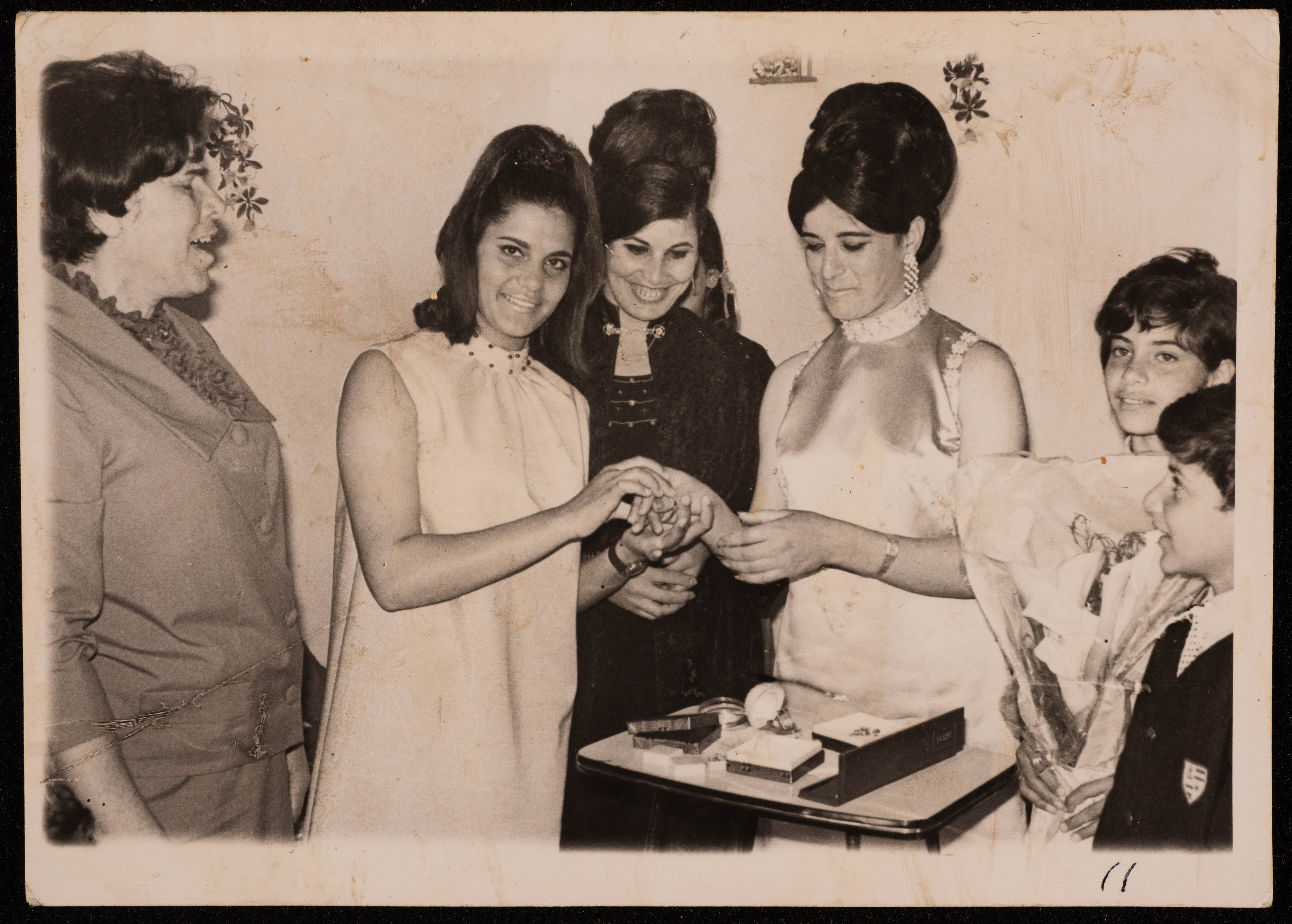Taken at al-Qddaira neighbourhood in Ramallah, this photograph shows Malika Qare on her engagement day to Simone Karkar who was absent due to work-related reasons in the Gulf back in the day, while Nadira Karkar is gifting the gold to Malika in the presence of Naifa Qare to the far left and Sonia Karkar, and to the bride's left stands Maha Kalis and Maher Kalis.
