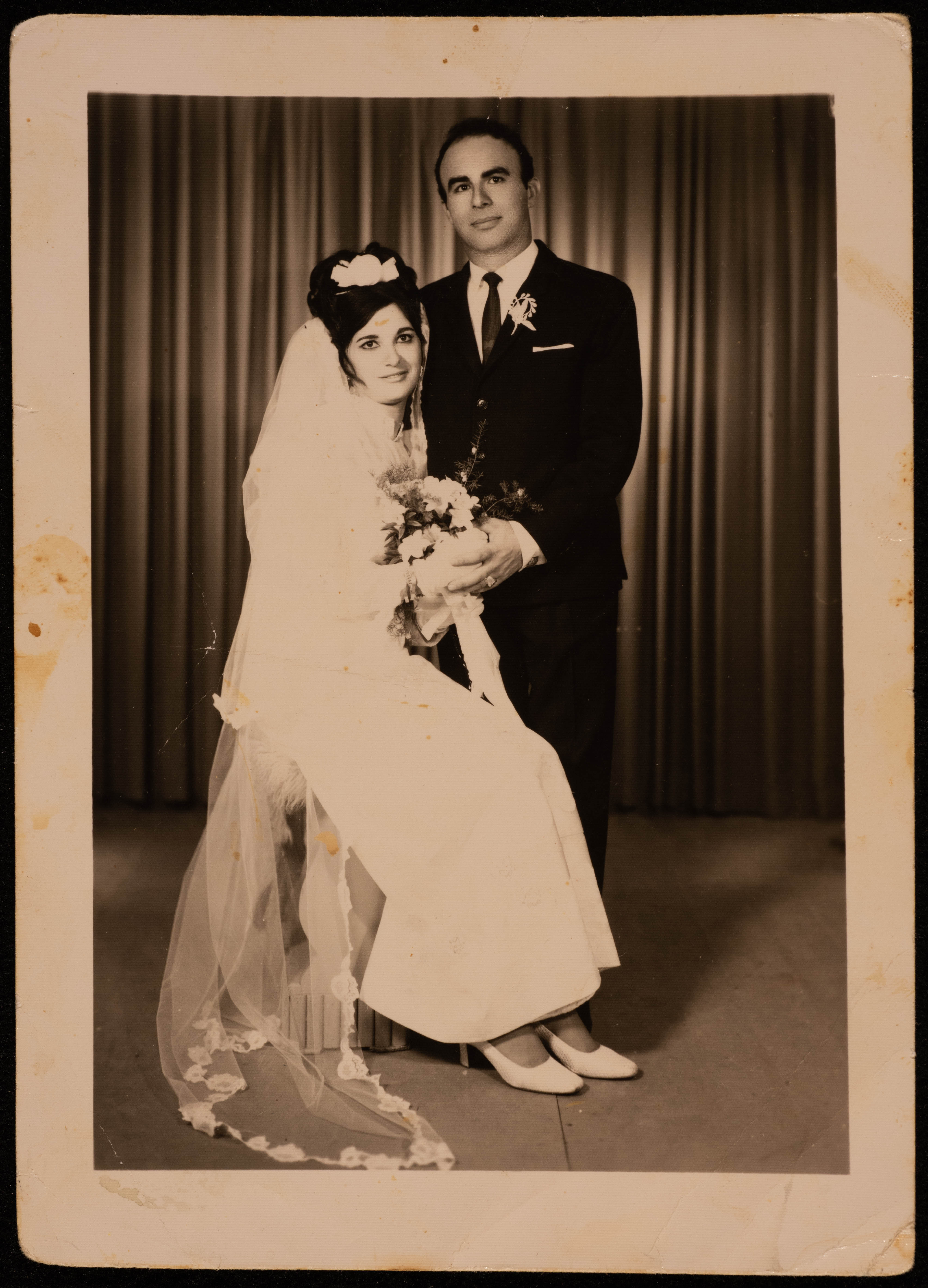 صورة غير مؤرخة، لإيستر حبش وسمير حبش في حفل زفافهما، وقد التقطت لهما في أحد استوديوهات رام الله.