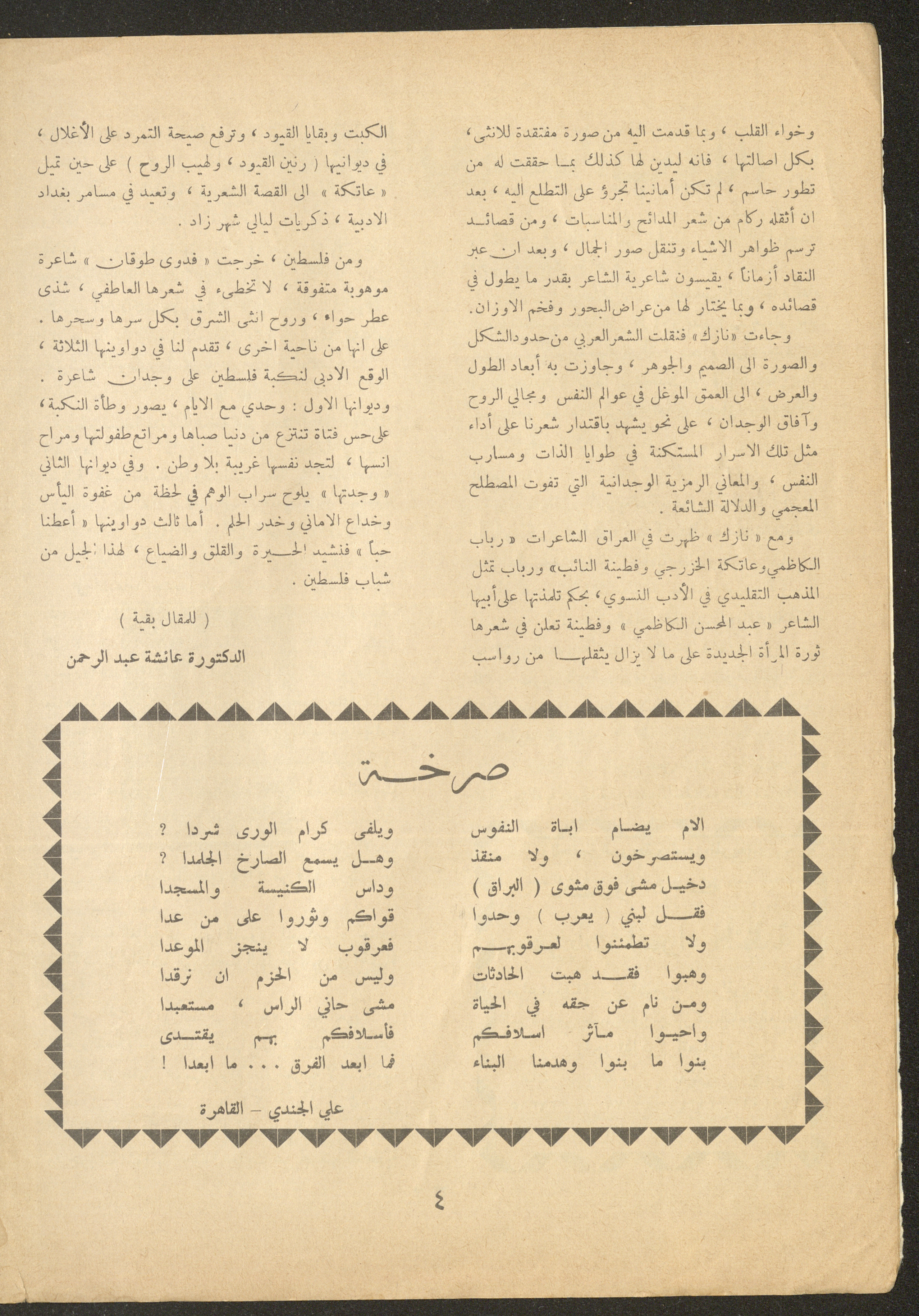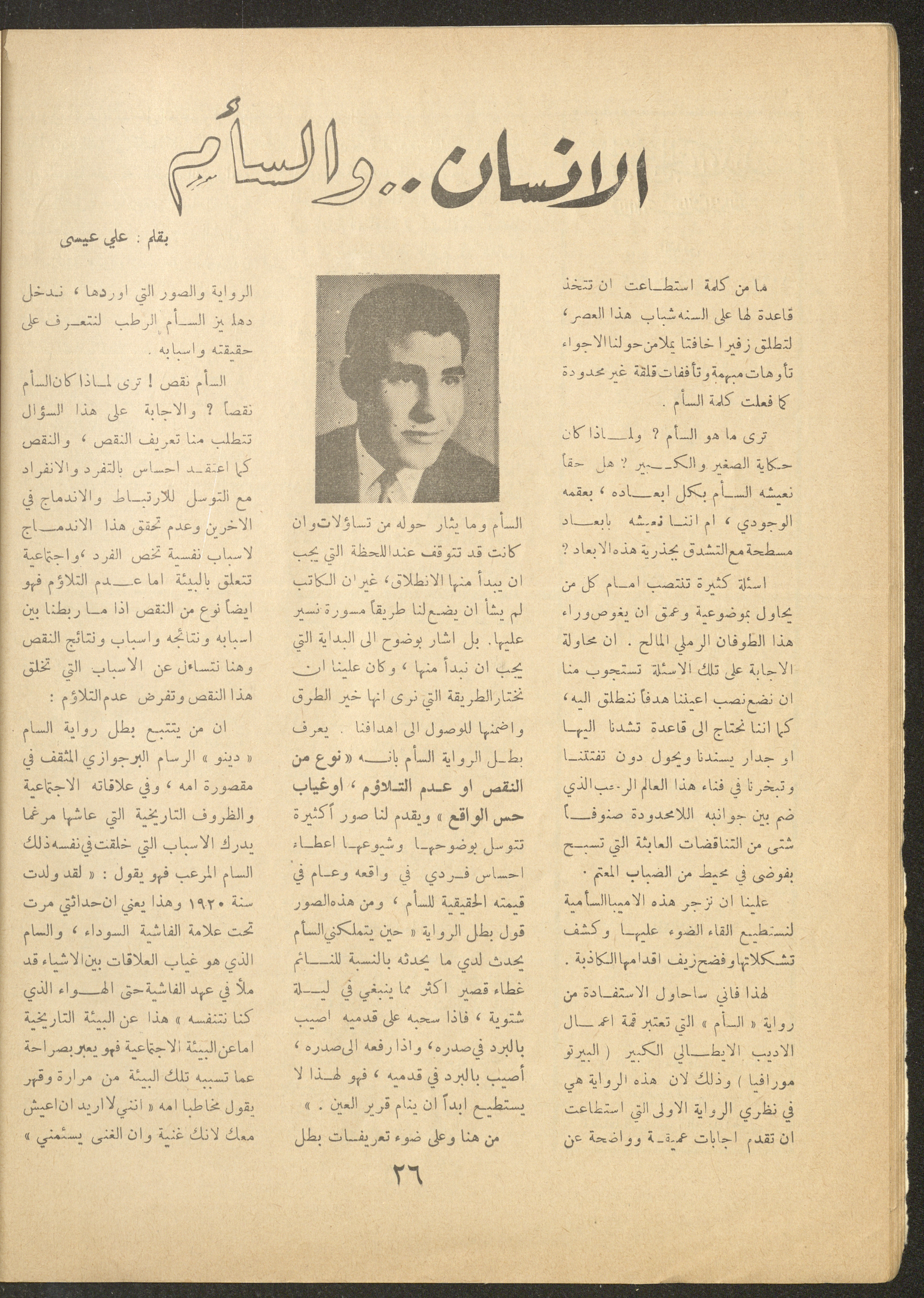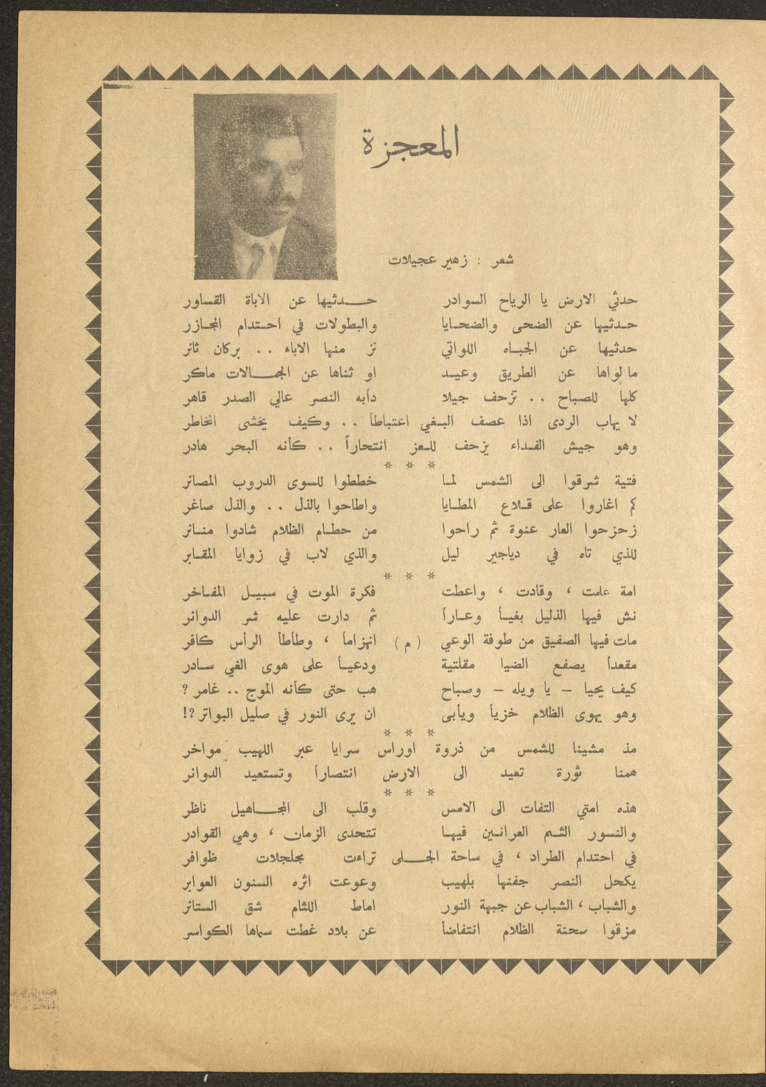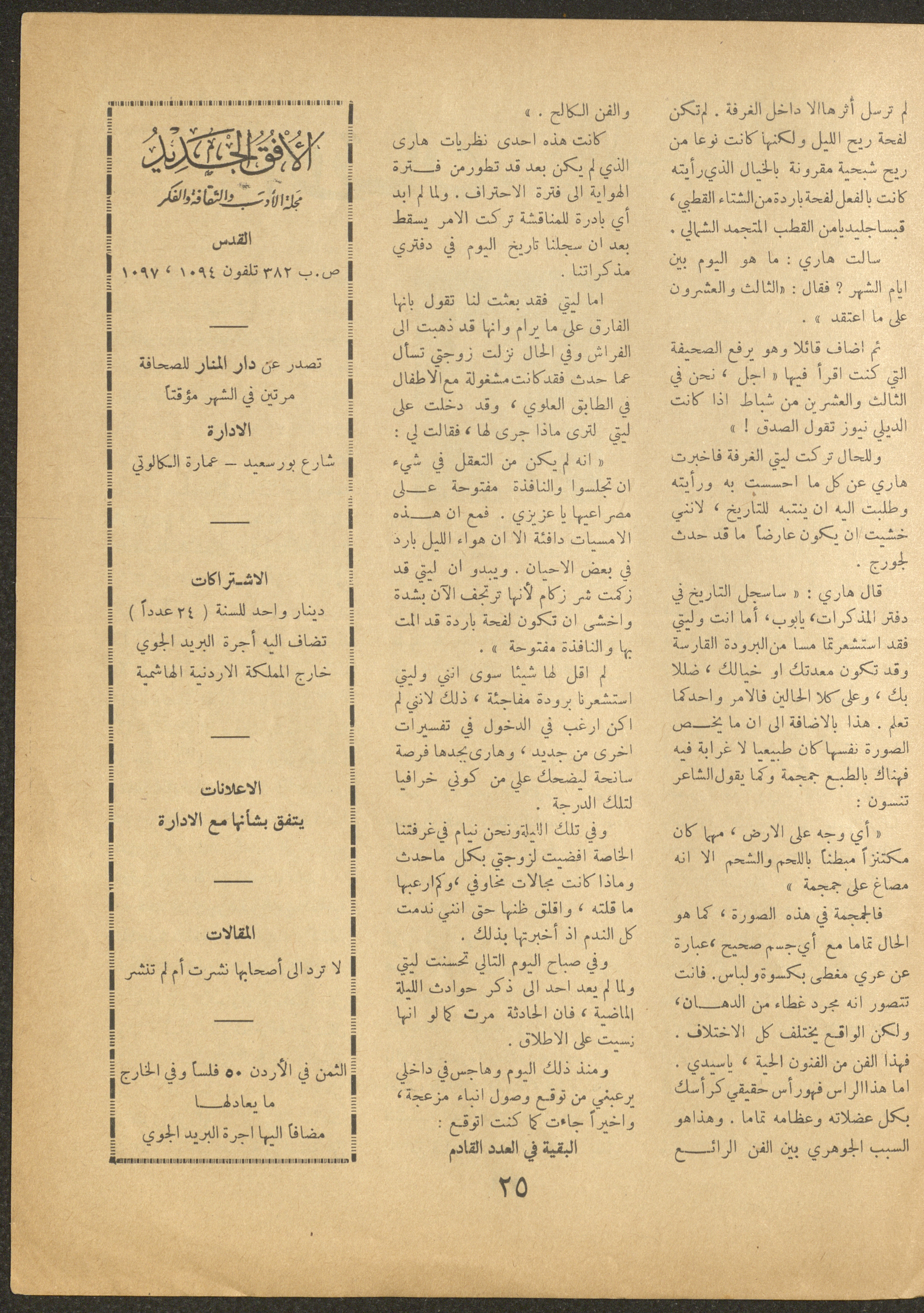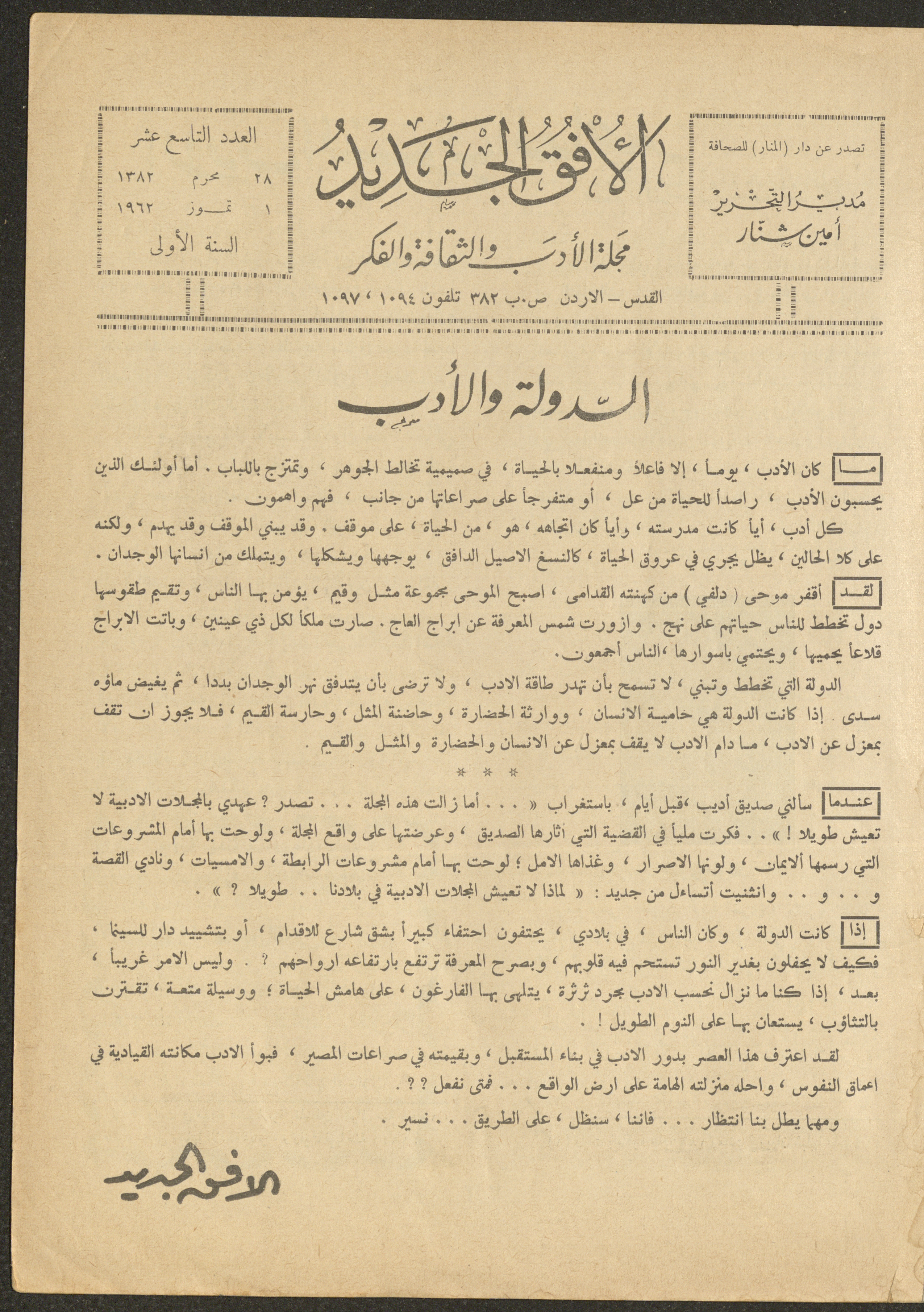 Issued by al-Manar Press Foundation in July 1962 and printed in Arabic, this 58-page document shows the 19th issue of al-Ofuq al-Jadeed Magazine, which is a monthly magazine concerned with literature, culture and thought, under the supervision of Editor-in-Chief Amin Shannar, and was printed in Dar al-Manar Press in Jerusalem. The price of the issue amounted to 60 fils and included photographs, articles, research, poems and stories, including: - "Contemporary Feminist Literature", research by Bint ash-Shati. - "Sarkha (Scream)", a poem by Ali al-Jundi. - "The Torn Letter", a story by Haitham al-Khattab. - "Shadow Play", a story by Tom Hood. - "Carnage", a story by Maliha abu Sharar. - "Laanat al-Kholoud (The Curse of Eternity)", a poem by Amin Shinnar. - "The Human and Boredom", research by Ali Issa.