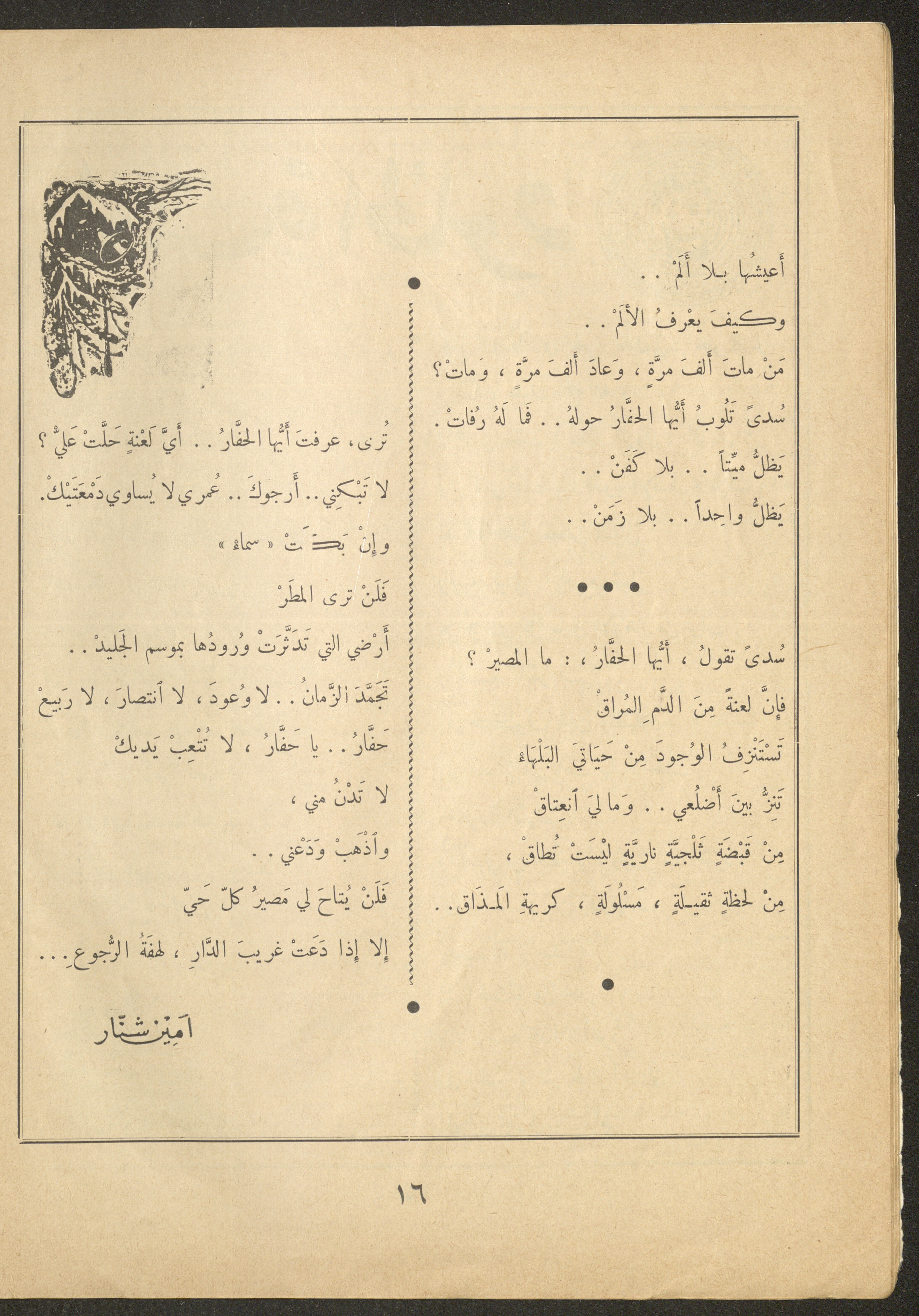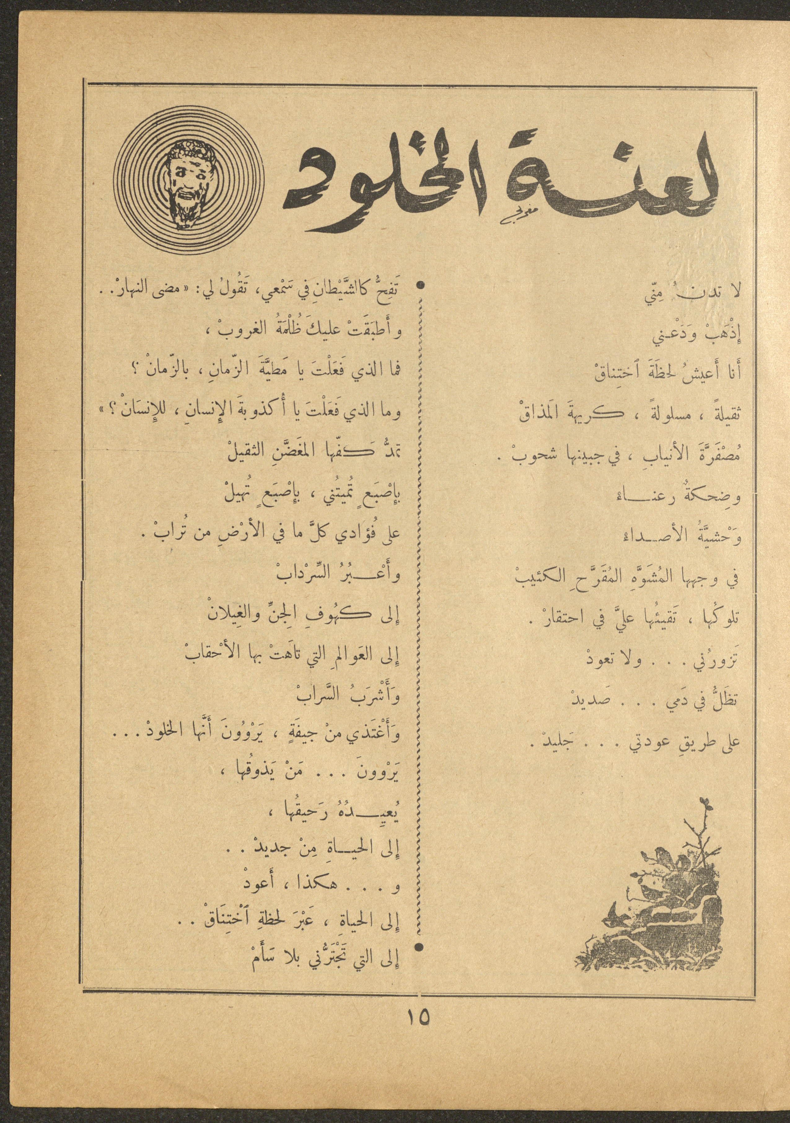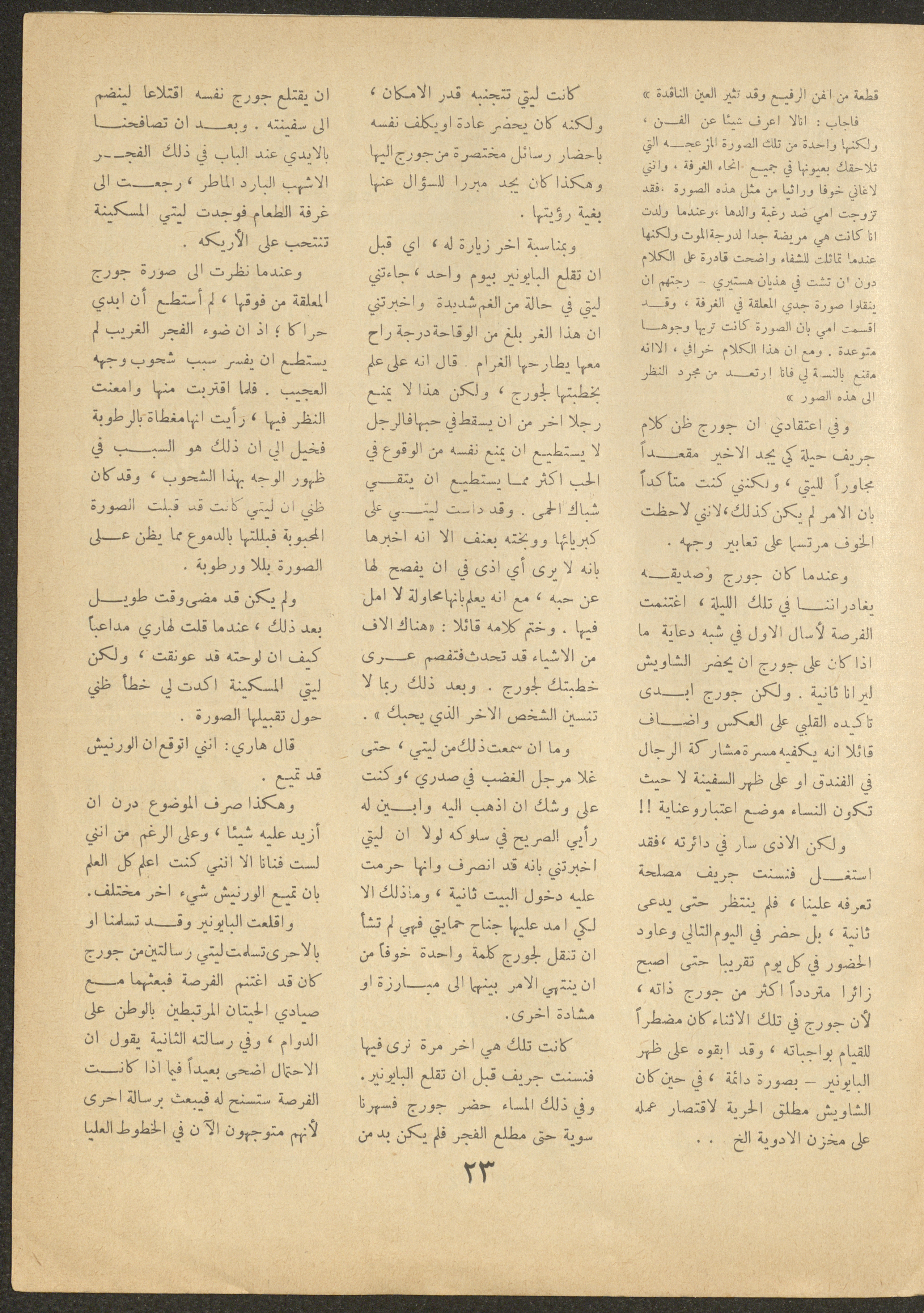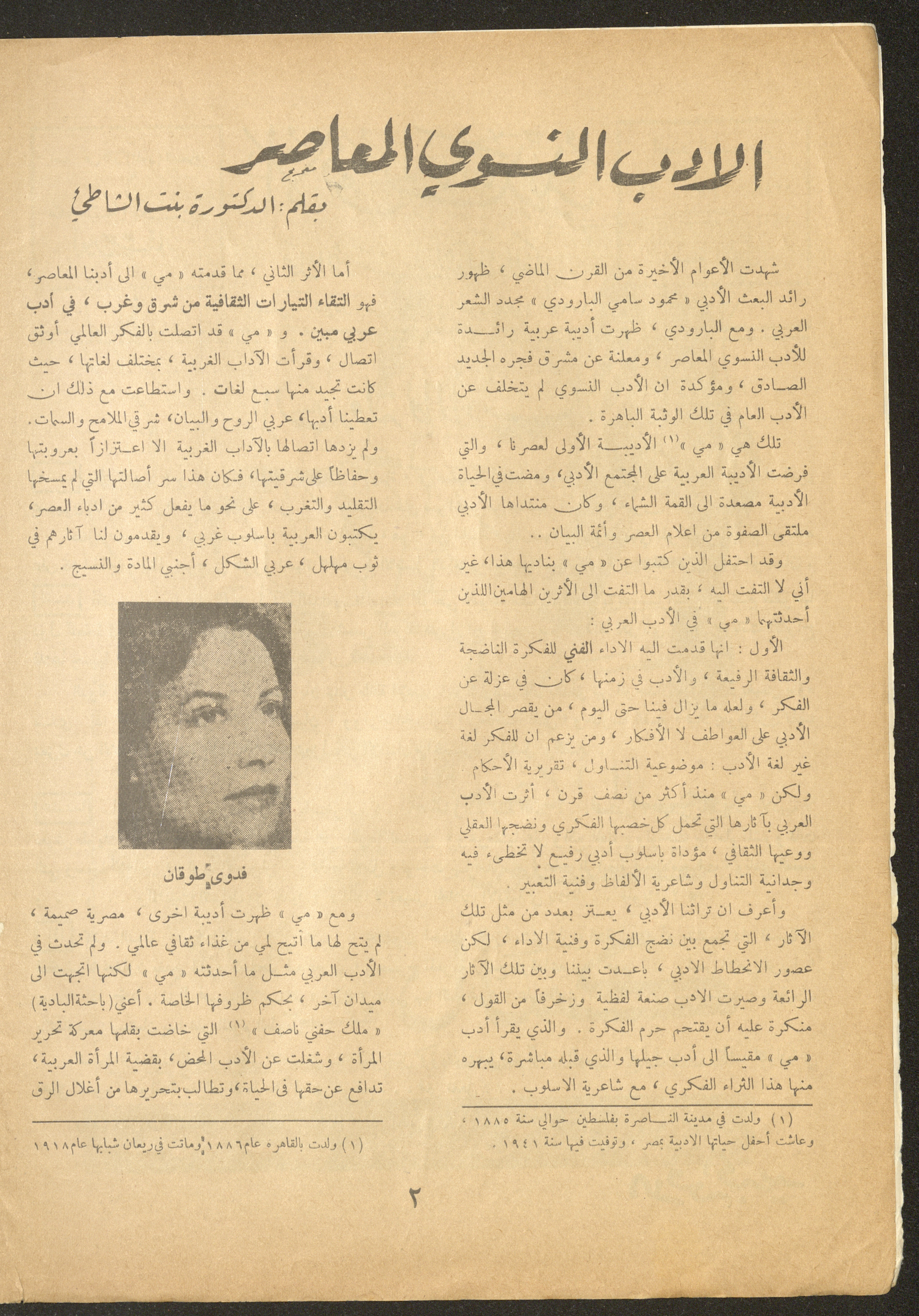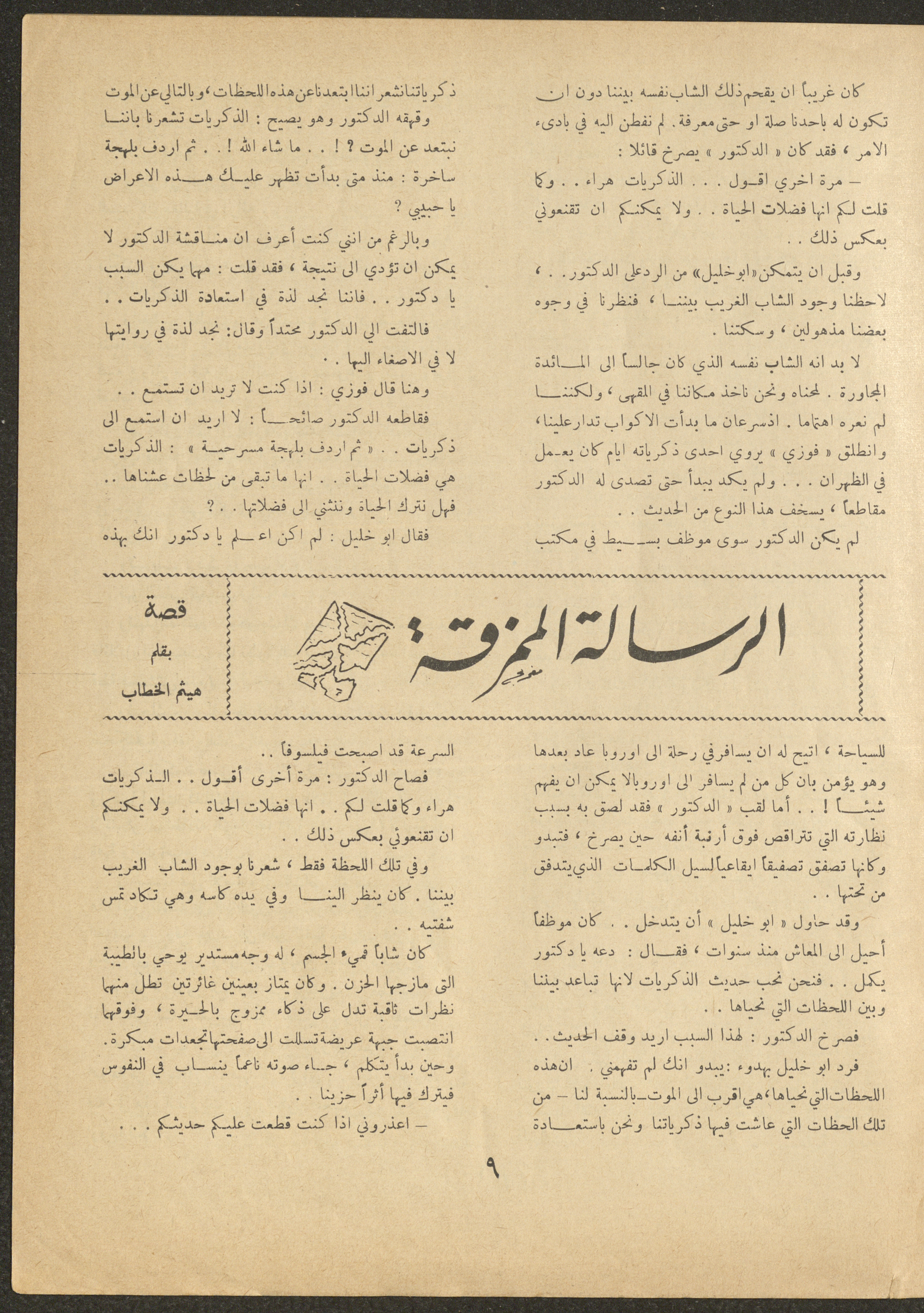 Issued by al-Manar Press Foundation in July 1962 and printed in Arabic, this 58-page document shows the 19th issue of al-Ofuq al-Jadeed Magazine, which is a monthly magazine concerned with literature, culture and thought, under the supervision of Editor-in-Chief Amin Shannar, and was printed in Dar al-Manar Press in Jerusalem. The price of the issue amounted to 60 fils and included photographs, articles, research, poems and stories, including: - "Contemporary Feminist Literature", research by Bint ash-Shati. - "Sarkha (Scream)", a poem by Ali al-Jundi. - "The Torn Letter", a story by Haitham al-Khattab. - "Shadow Play", a story by Tom Hood. - "Carnage", a story by Maliha abu Sharar. - "Laanat al-Kholoud (The Curse of Eternity)", a poem by Amin Shinnar. - "The Human and Boredom", research by Ali Issa.