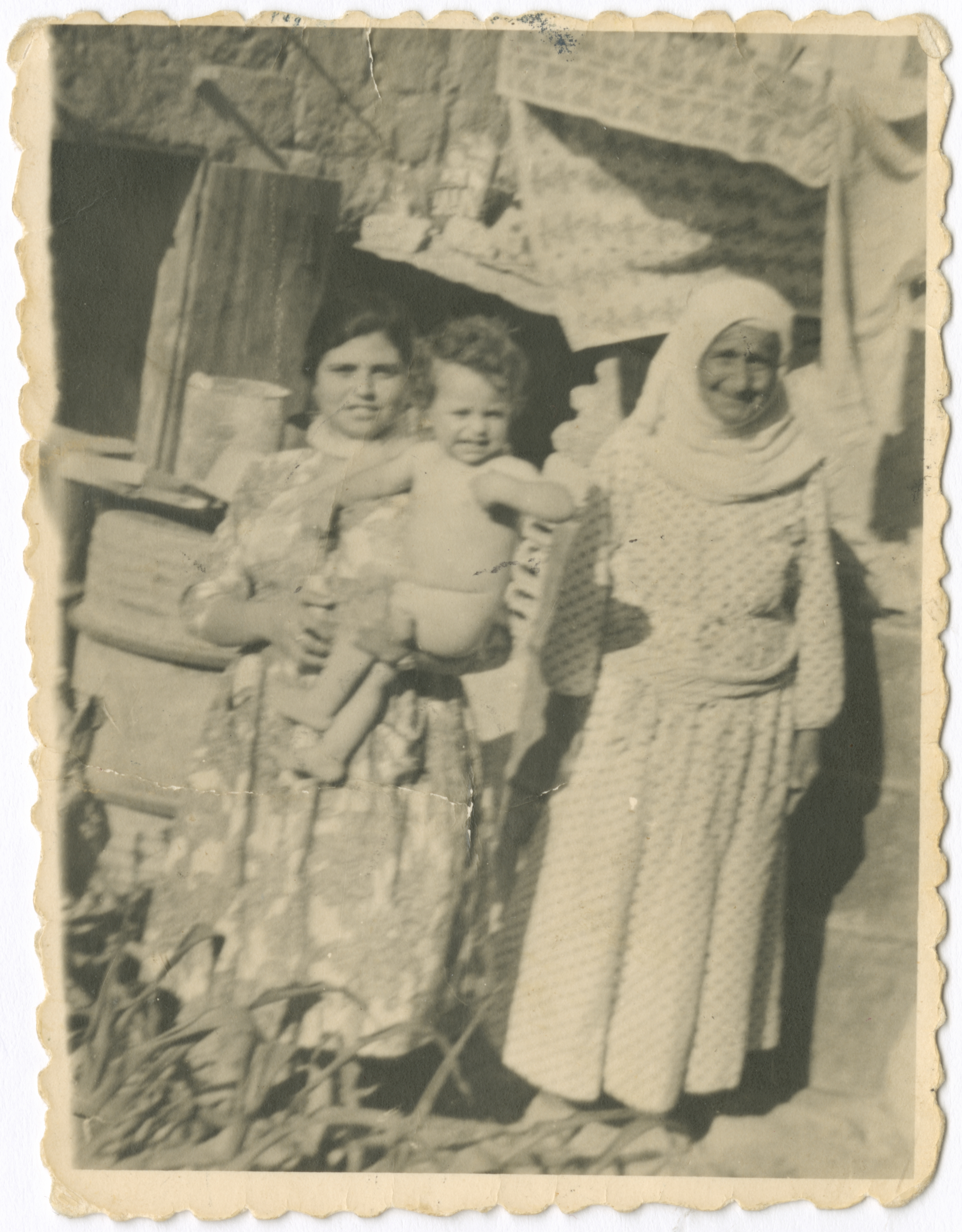 سيدة تحمل حفيدها و بجانبها ابنتها من أمام بركيتهم المبنية من الحجر و الخشب في شعب.