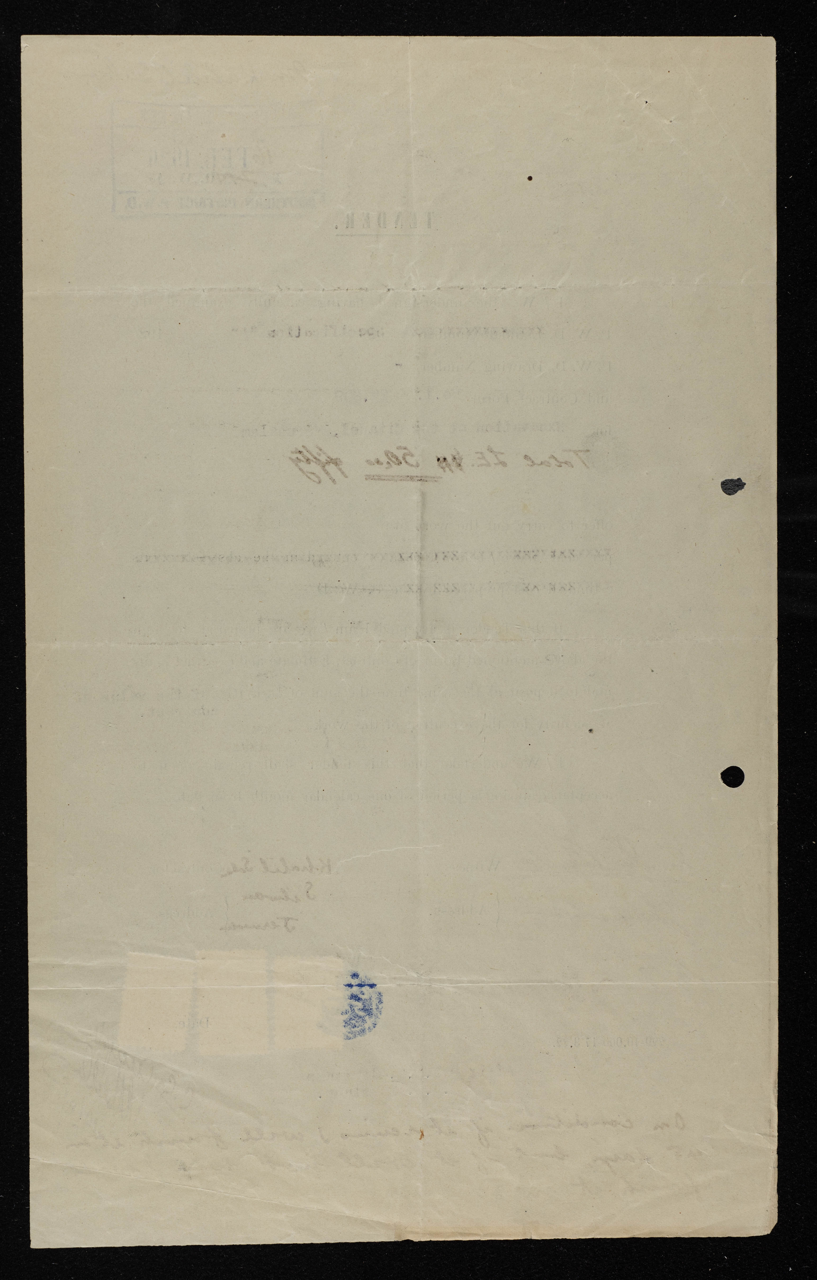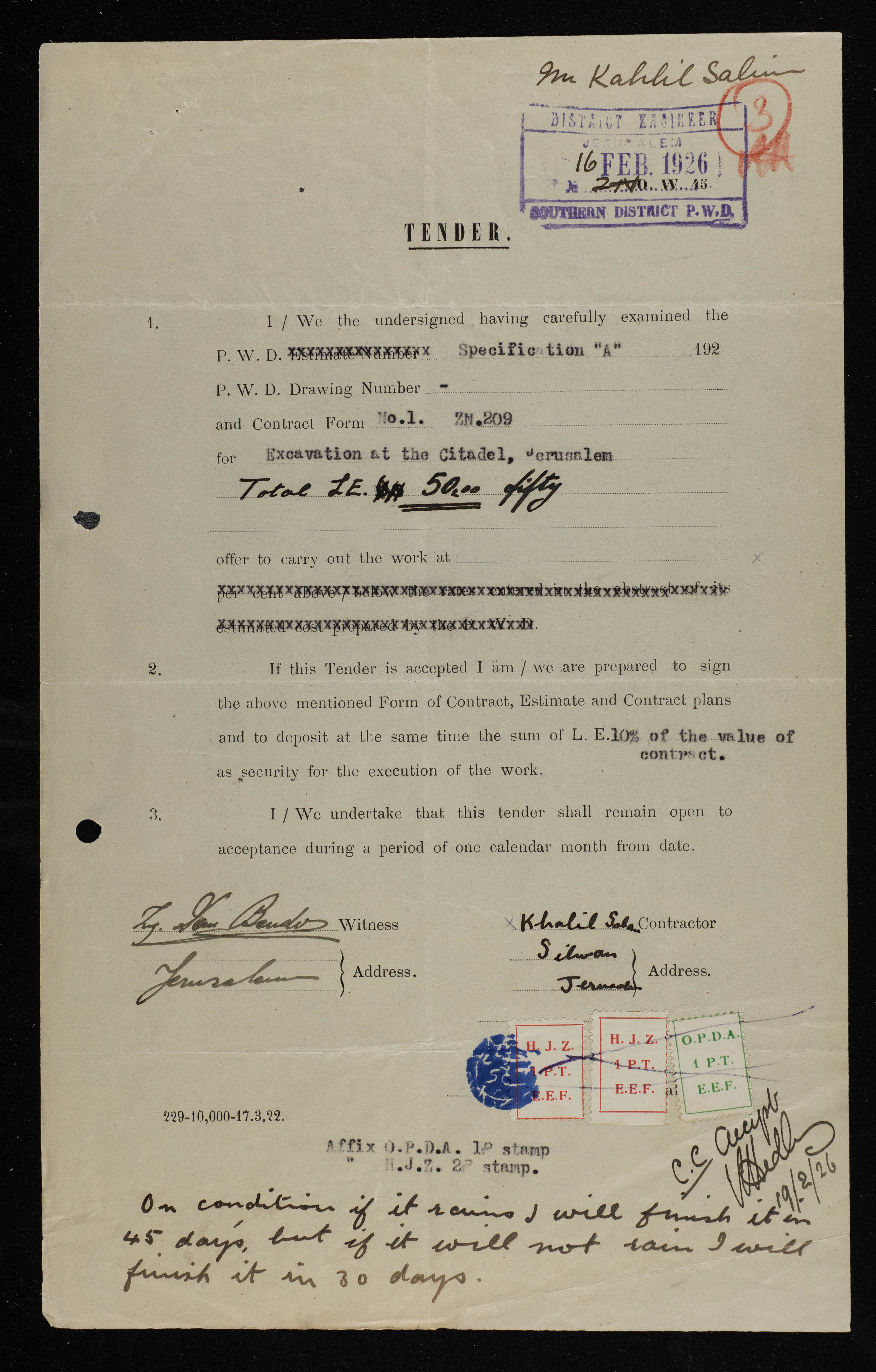An engineering tender issued by the "British Mandate for Palestine" for excavation work in Al-Qal'a area in Jerusalem