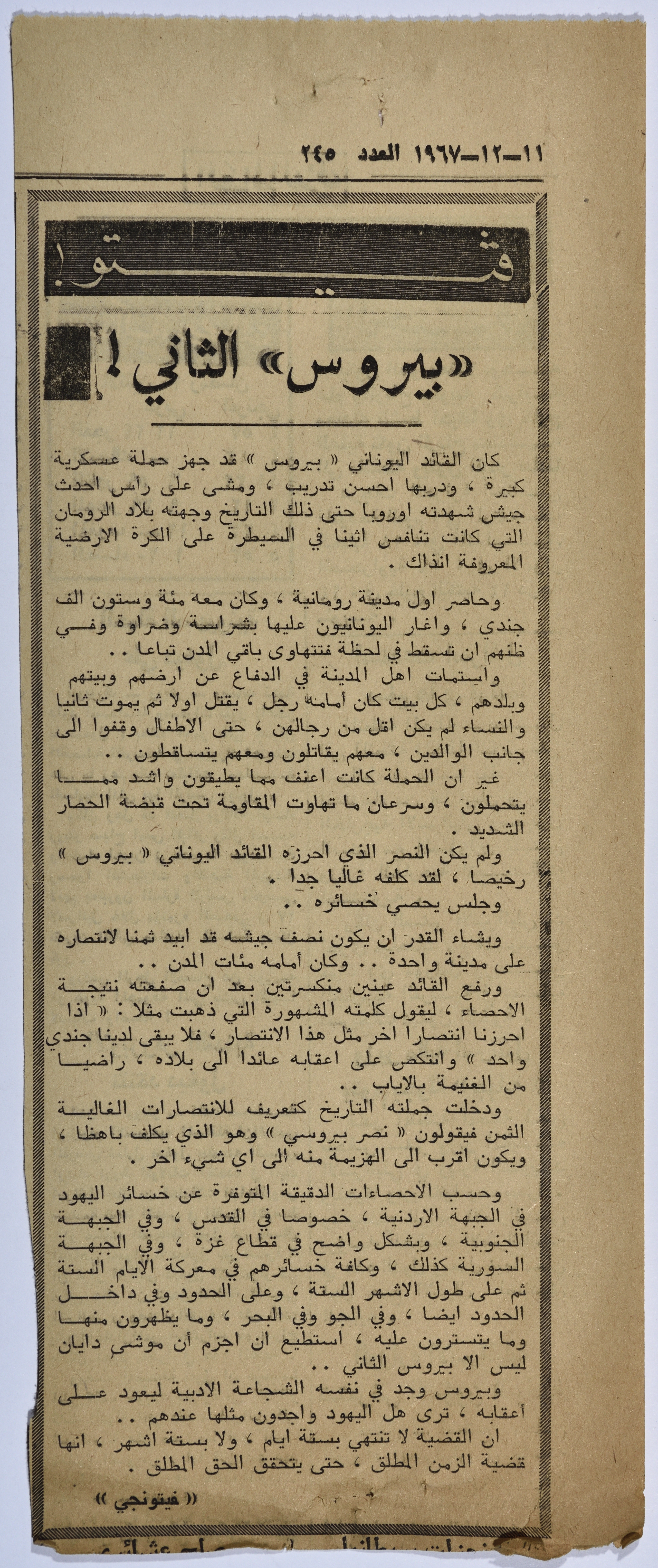 "(Pyrrhus) the Second", a Clipping from Palestine Newspaper, 1967