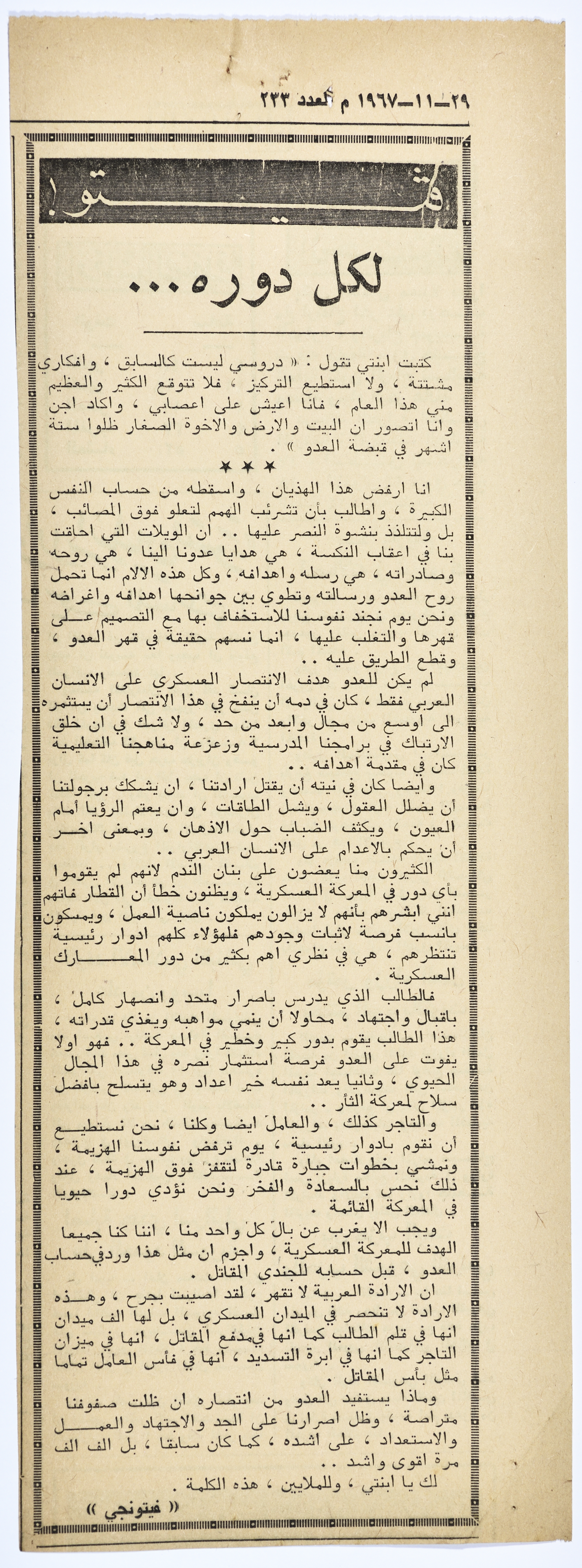"لكل دوره..."، قصاصة من جريدة فلسطين، 29 تشرين الثاني1967