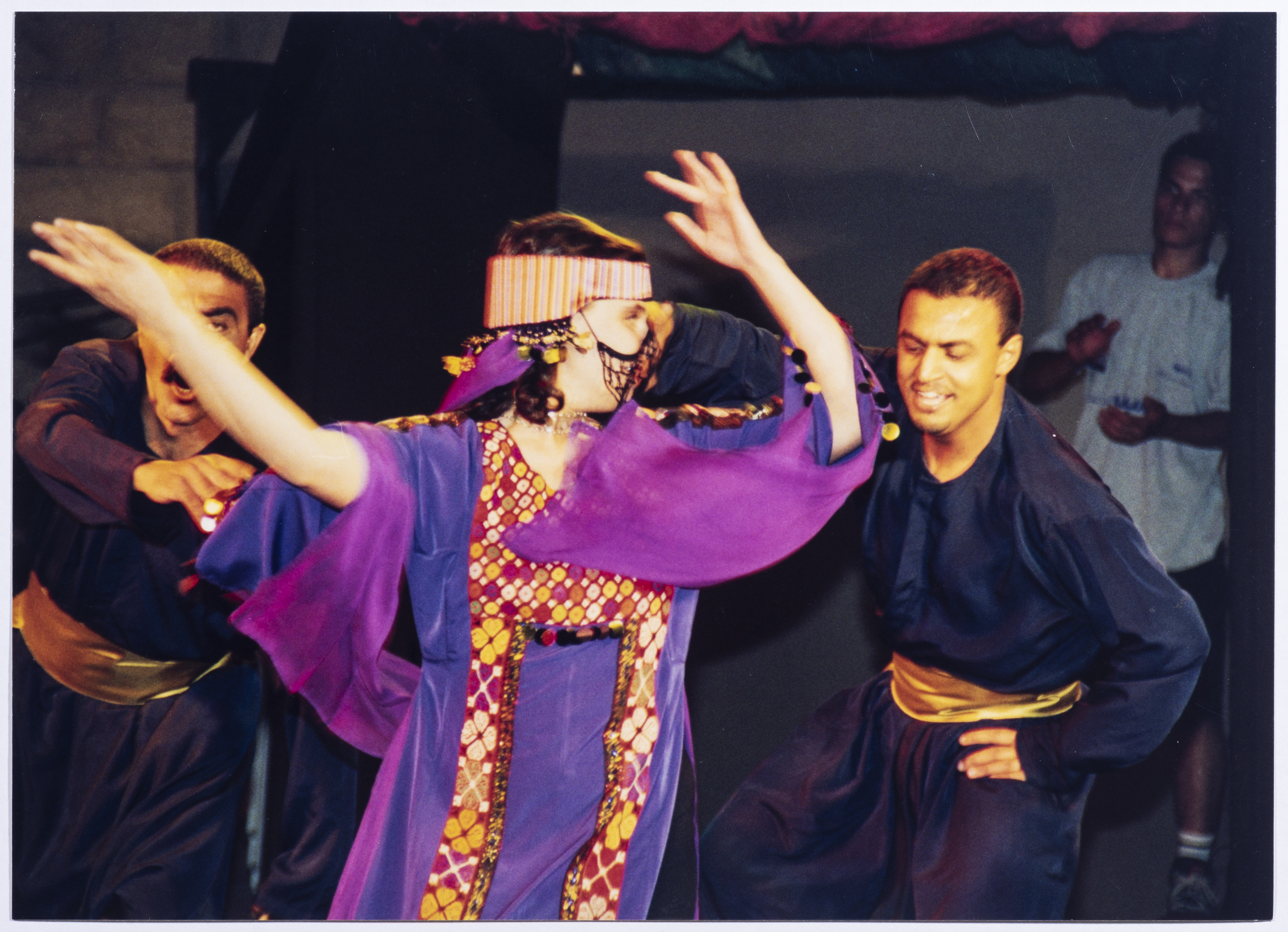 صورة ملونة ترصد ملمحاً من عرض فرقة الفنون الشعبية ضمن مهرجان فلسطين الدولي في جامعة بيرزيت عام 1999.
