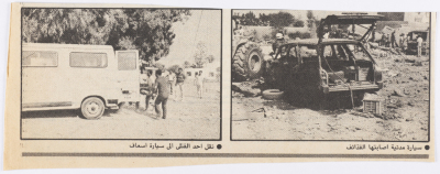 "سيارة مدنية أصابتها القذائف"، قصاصة من جريدة القبس، تشرين الأول 1985