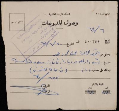 "وصل قبض"، صادر عن المملكة الأردنية الهاشمية لخميس جبر، 30 حزيران 1963