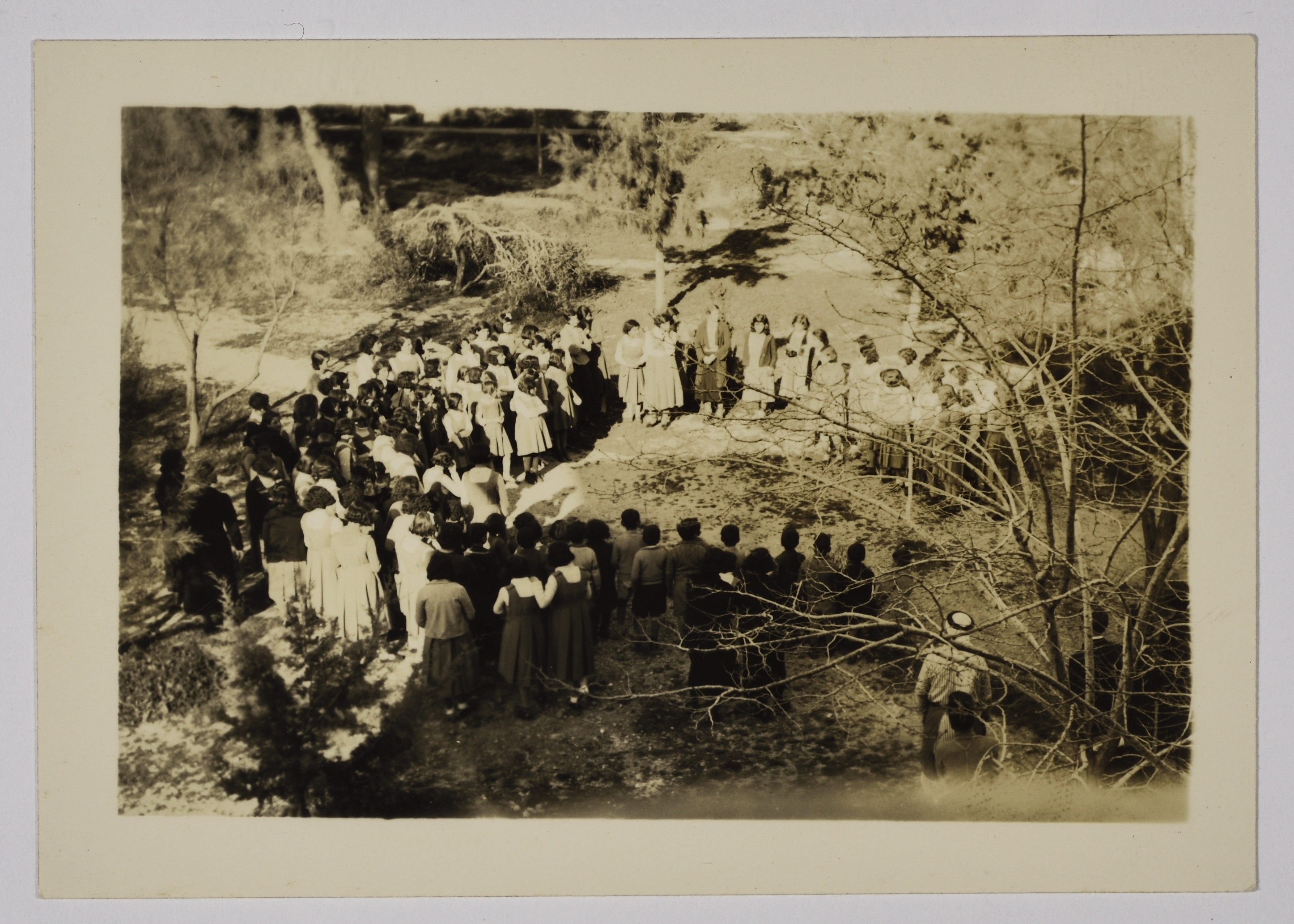 Found in the Friends School Collection, this black-and-white photograph shows students from the Ramallah Friends School for with the teaching staff on a school trip in 1936.