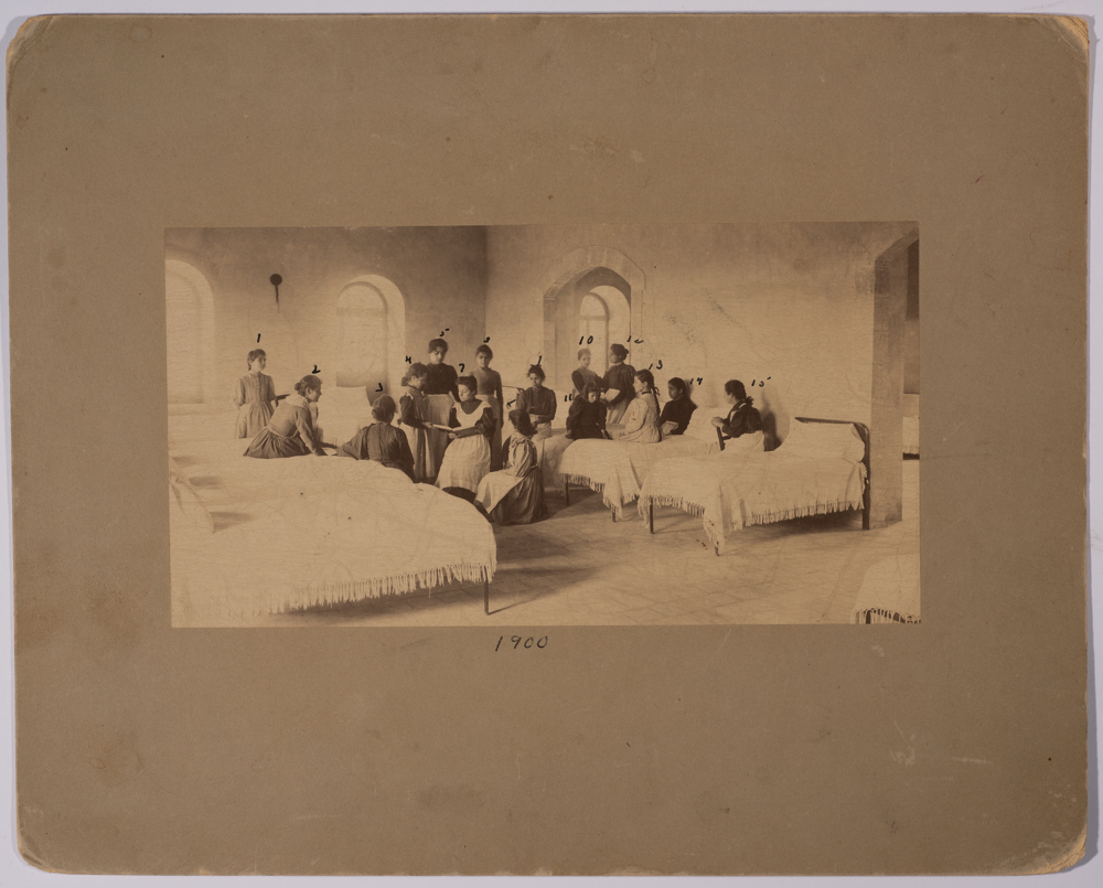 صورة غير ملونة يظهر فيها مجموعة من طالبات مدرسة الفرندز في سكن المدرسة عام 1900، وُجدت في مجموعة مدارس الفرندز .