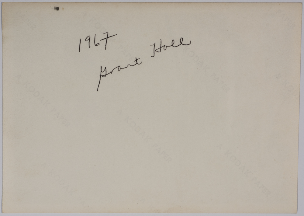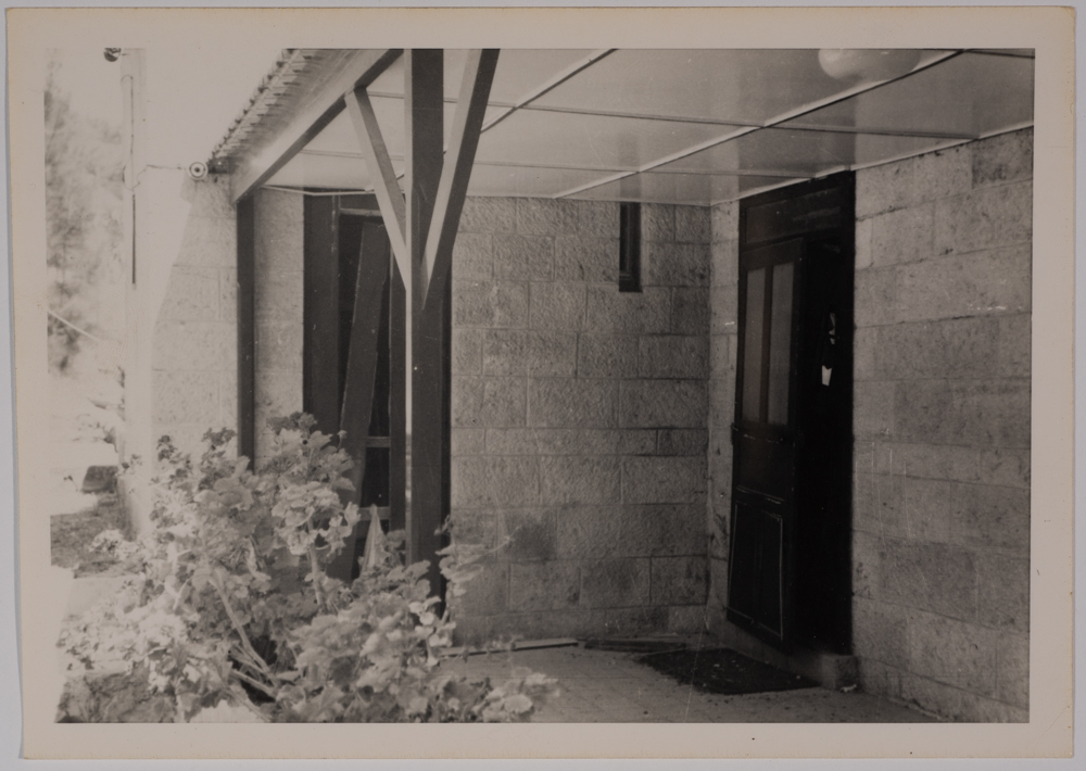 صورة غير ملونة يظهر فيها مدخل أحد المباني التابعة لمدرسة الفرندز وشجرة عام 1967، وُجدت في مجموعة مدارس الفرندز .