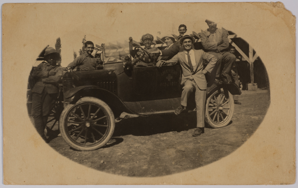 صورة غير ملونة يظهر فيها مجموعة أشخاص في سيارة ، وُجدت في مجموعة مدارس الفرندز .