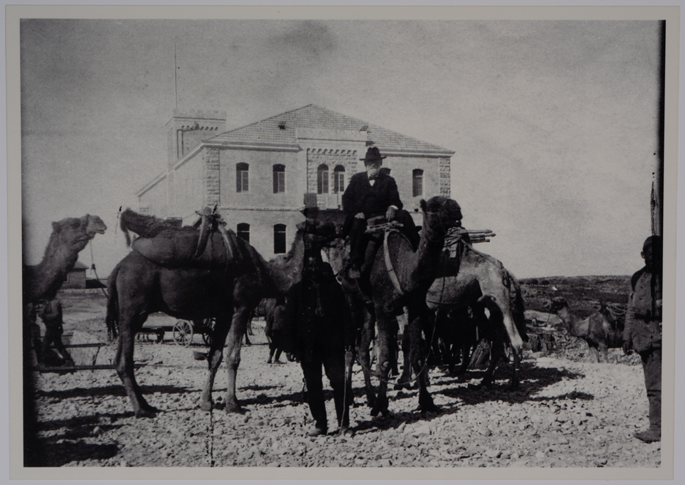 صورة غير ملونة يظهر فيها شخص يركب جَمَل أمام مبنى، وُجدت في مجموعة مدارس الفرندز .