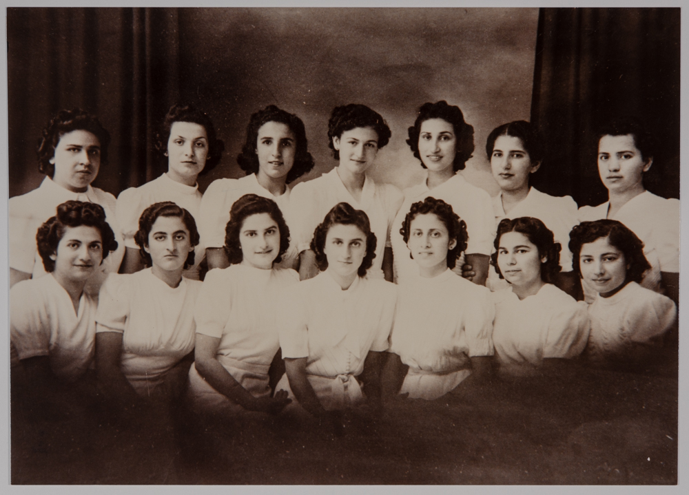 صورة غير ملونة يظهر فيها مجموعة طالبالت من مدرسة الفرندز عام 1942، وُجدت في مجموعة مدارس الفرندز .