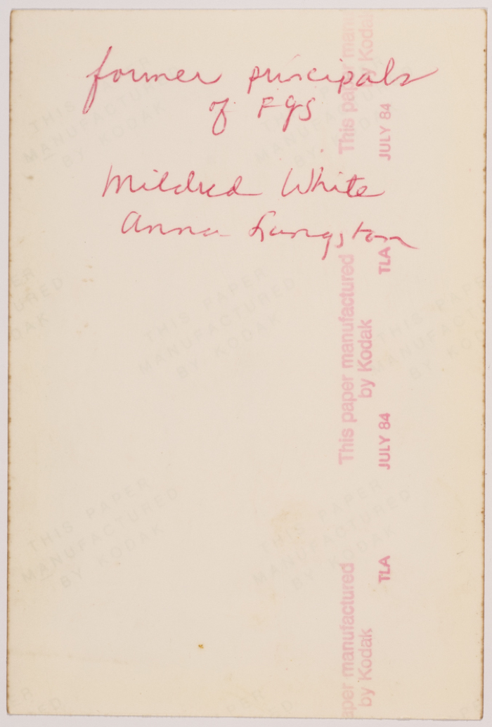 صورة ملونة يظهر فيها المديرات السابقات لمدرسة الفرندز للبنات "ميلدريد وايت" وآنا لانجستون"، وُجدت في مجموعة مدارس الفرندز .