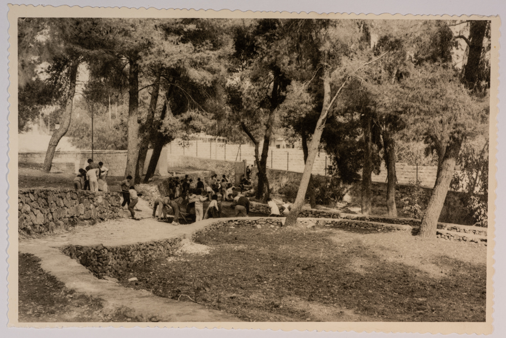 صورة غير ملونة يظهر فيها مجموعة أشخاص في ساحة، وُجدت في مجموعة مدارس الفرندز .