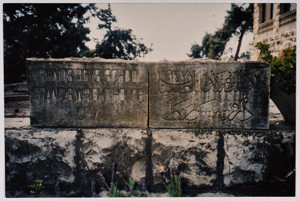 صورة ملونة يظهر فيها حجر محفور عليه اسم مدرسة الفرندز باللغتين العربية والإنجليزية موجود في المدرسة، وُجدت في مجموعة مدارس الفرندز .