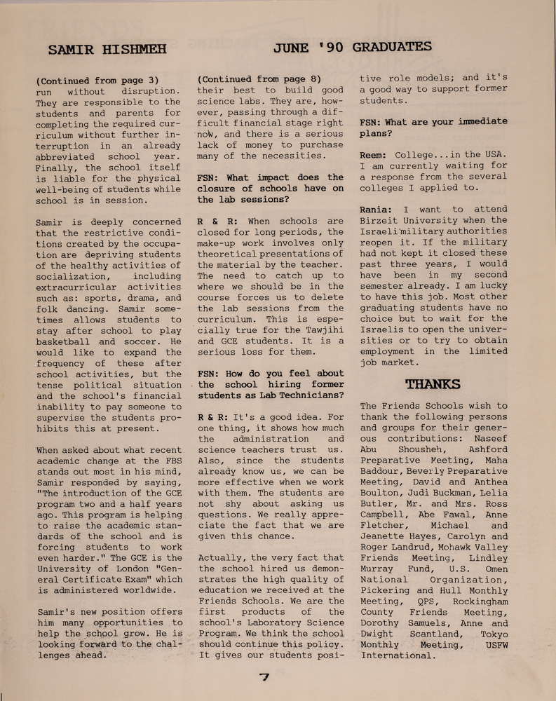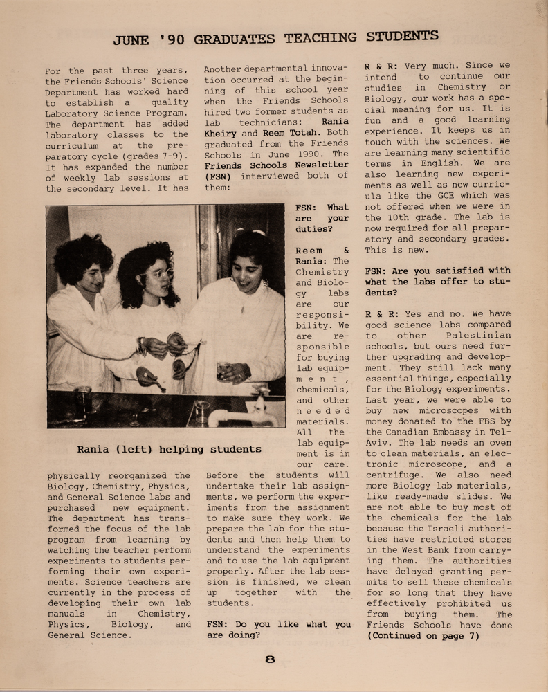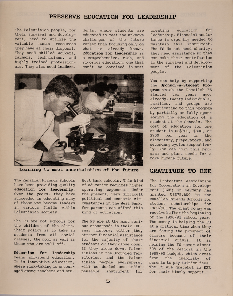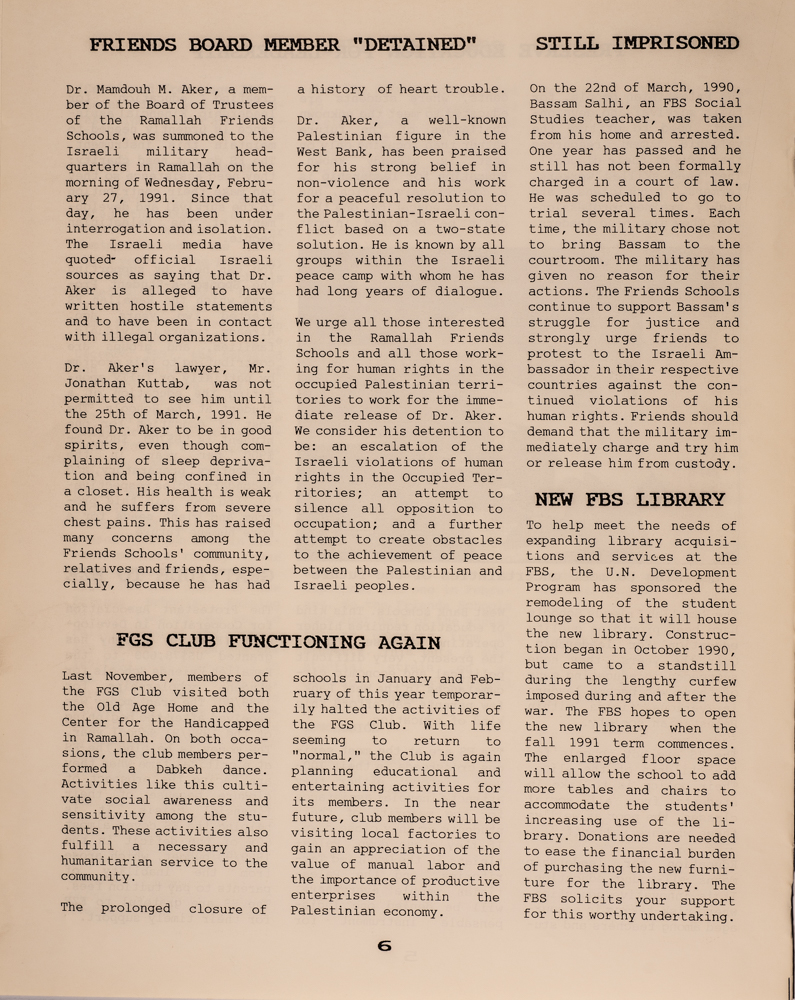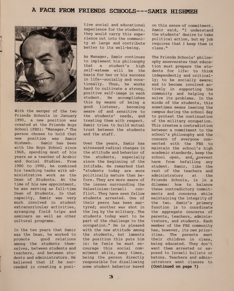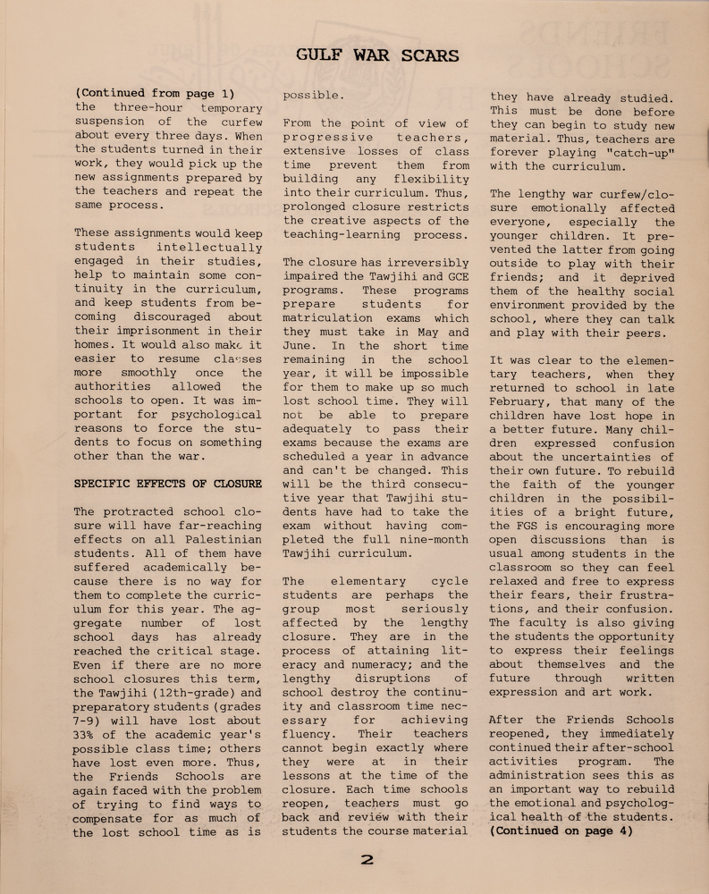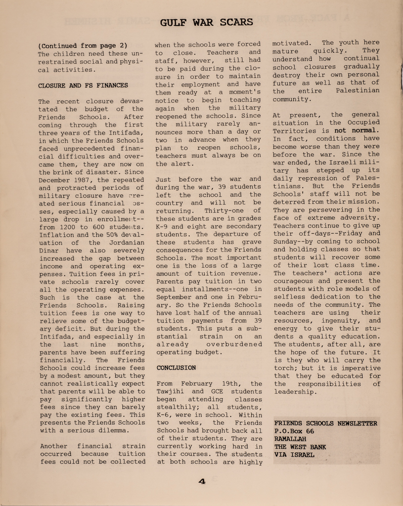 An 8-page printed material in English, a newsletter of the Friends Schools in Ramallah, Issue 4 No 2 for the winter of 1991.