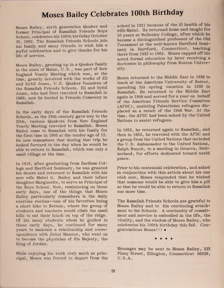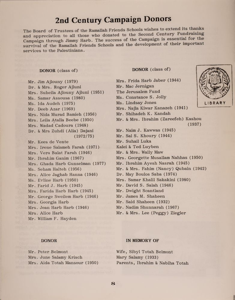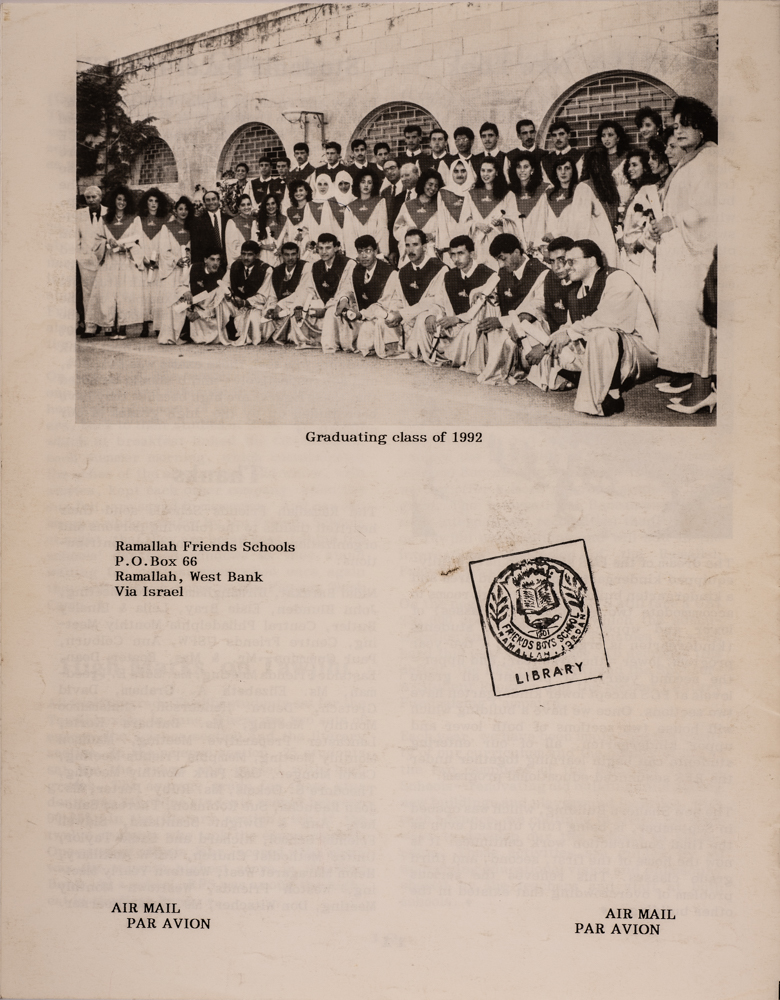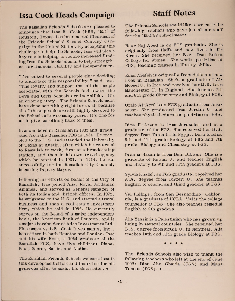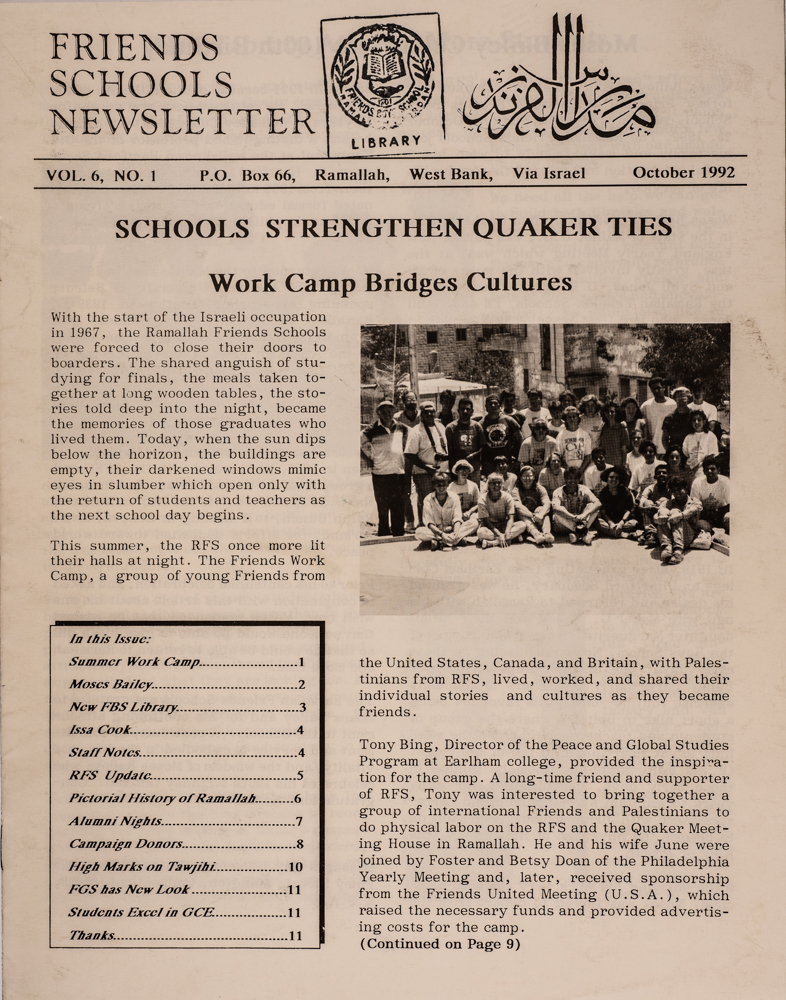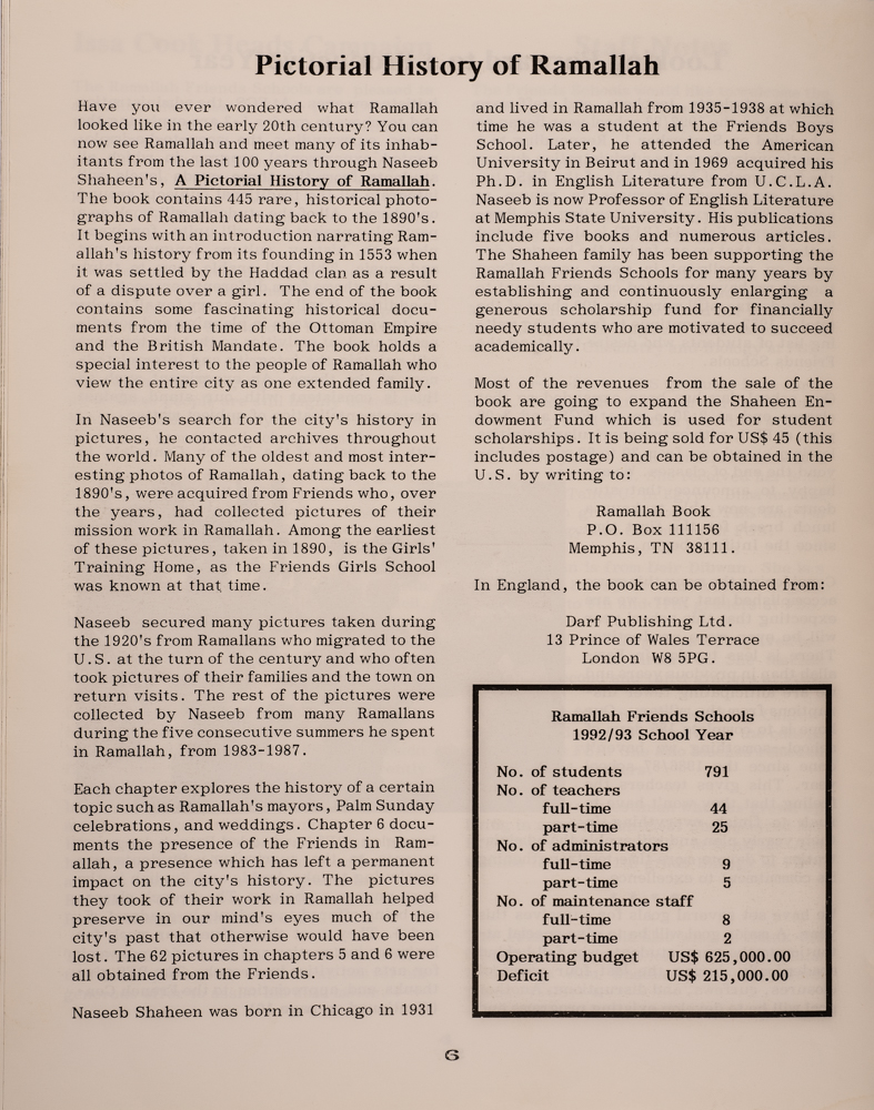 An 8-page printed material in English, a newsletter of the Friends Schools in Ramallah, Issue 6 No 1 for October of 1992.
