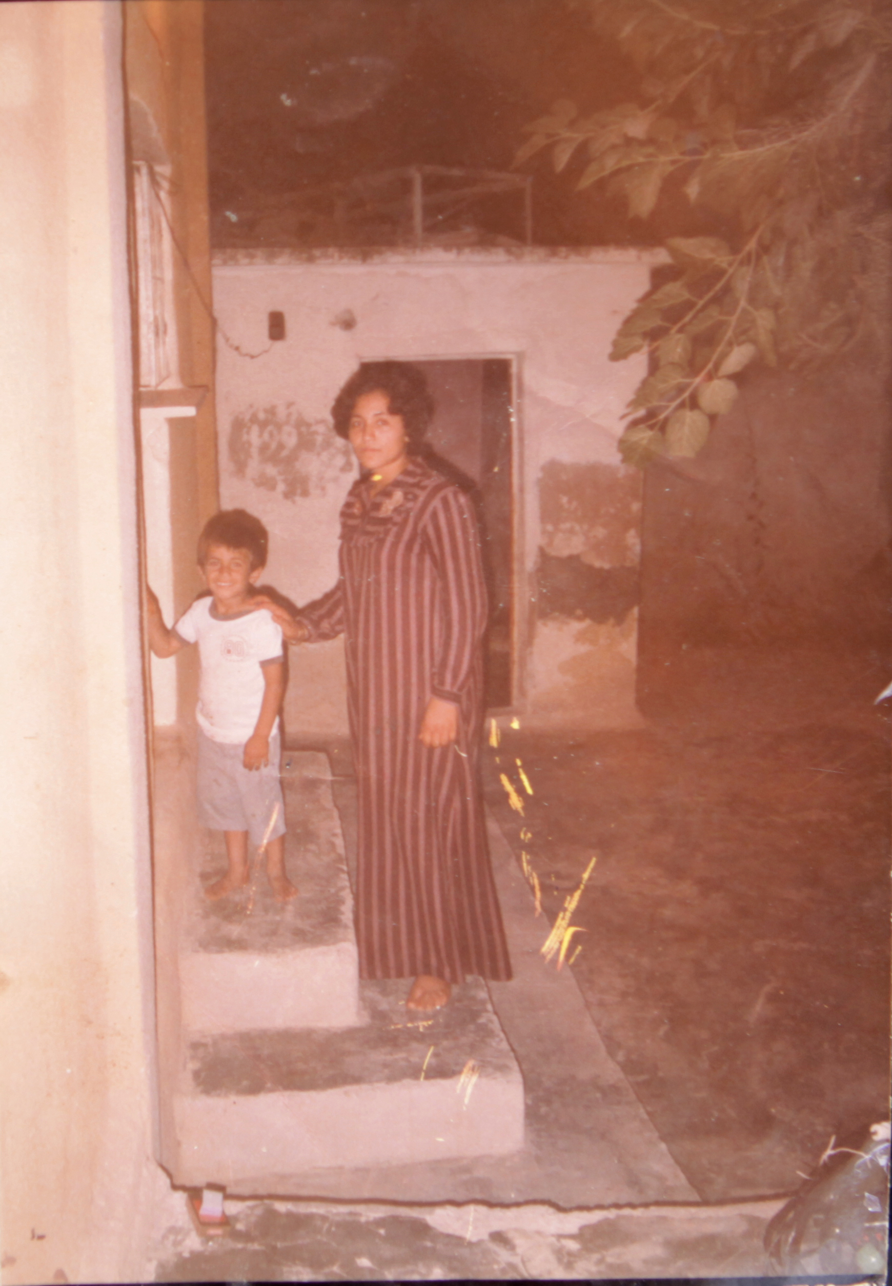 صورة ملونة لامرأة وطفل من مخيم الدهيشة للاجئين. الصورة هي واحدة من مجموعة صور توثق الحياة الاجتماعية والسياسية في مخيم الدهيشة، يقتنيها نضال أبو عكر