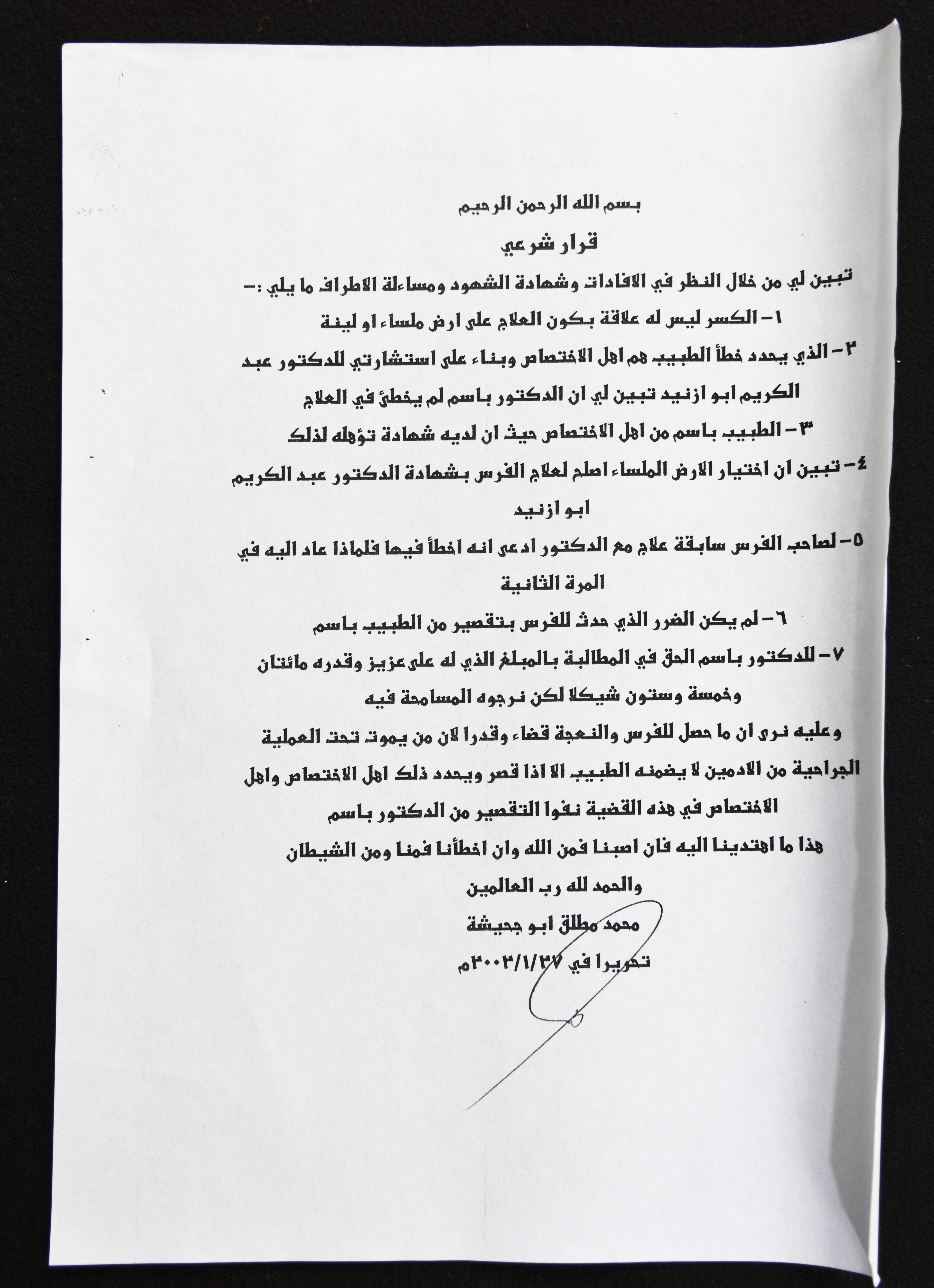 قرار شرعي صادر عن المُحكّم محمد أبو جحيشة في قضية مقتل فرس ونعجة أثناء العلاج، حُرّر بتاريخ 27 كانون الثاني 2002.