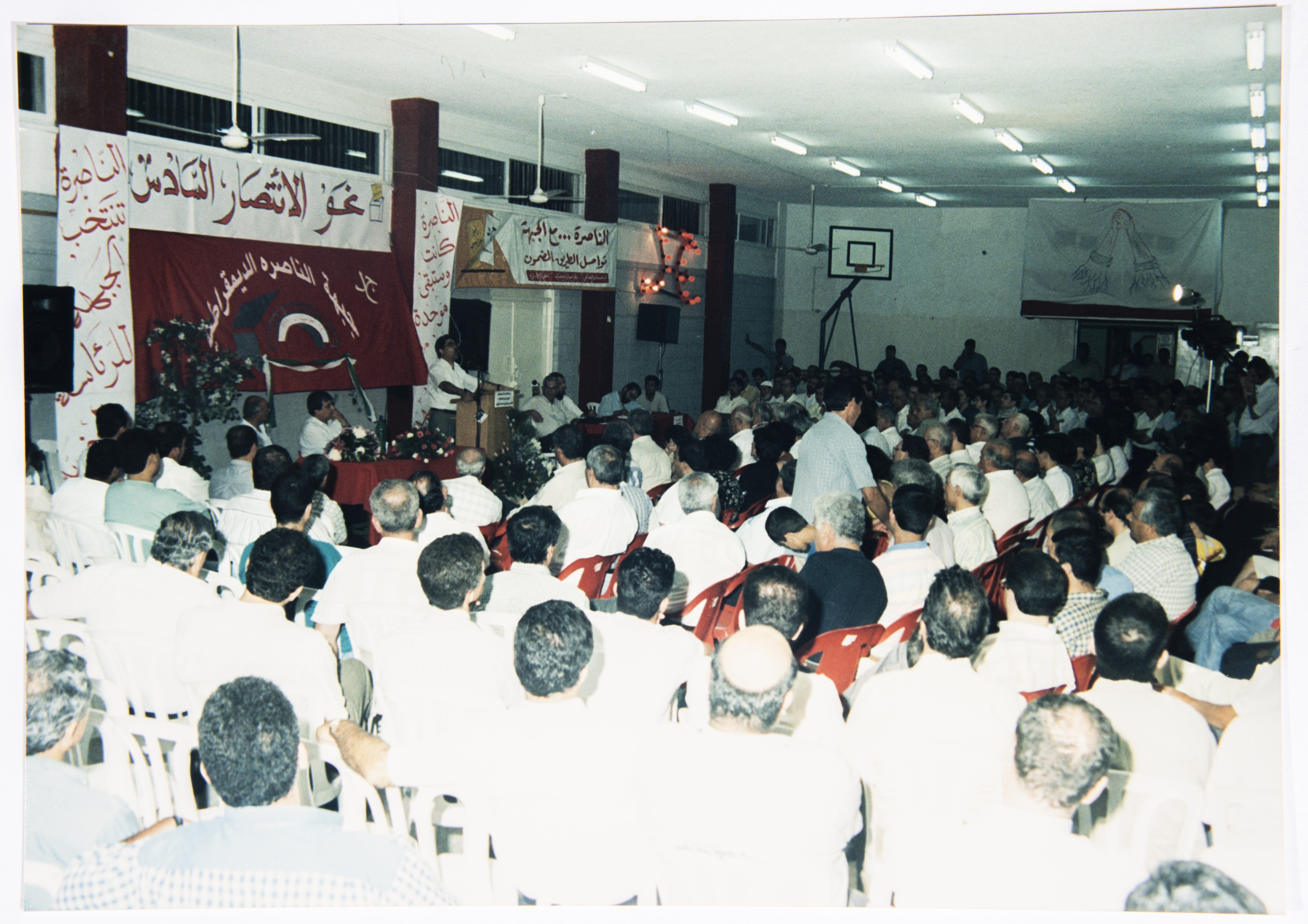 صورة ملونة من اجتماع شعبي ضمن الحملة الانتخابية لرامز جرايسي في انتخابات بلدية الناصرة في التسعينات، ترشَّح في حينها عن جبهة الناصرة الديمقراطية.