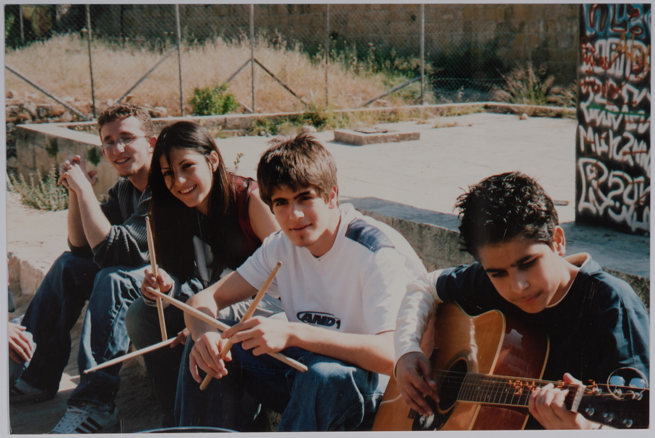 مجموعة من طلبة مدرسة الفرندز يحملون آلاتهم الموسيقية في ملعب المدرسة وذلك عام 1994.;Taken in 1994, this photograph shows some students from the Ramallah Friends School holding their musical instruments at the school football field.