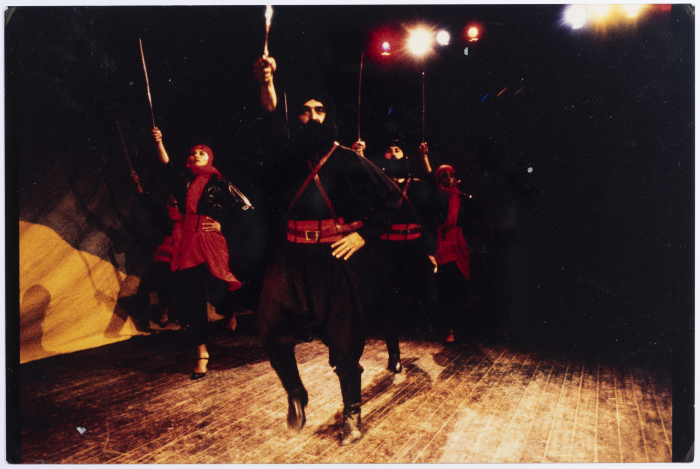 صورة ترصد ملمحًا من عرض "مرج بن عامر" لفرقة الفنون الشعبية على خشبة مسرح الحكواتي في القدس عام 1989.