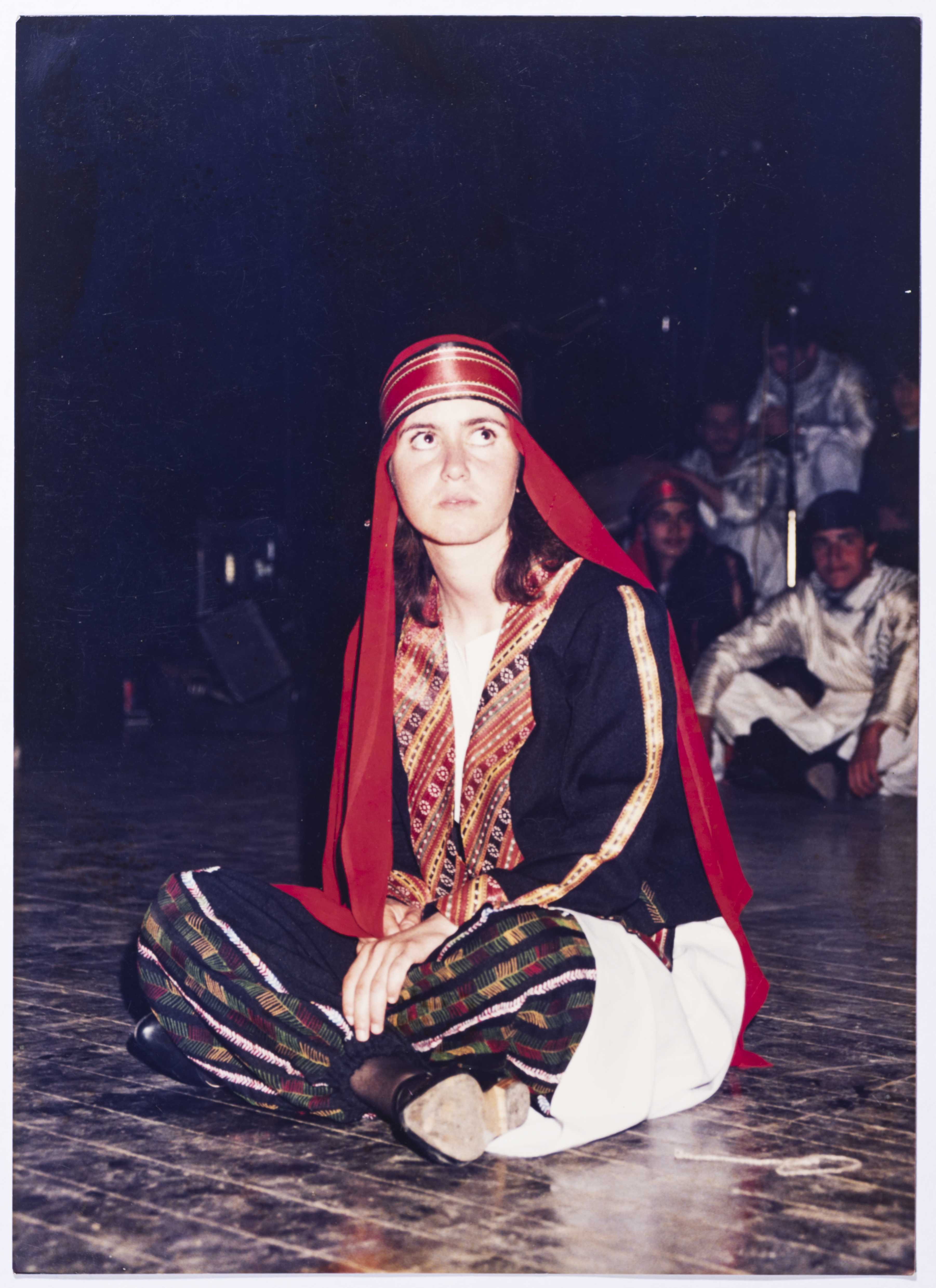 A photograph capturing a glimpse of el-Funoun Palestinian Dance Troupe's "Marj Ibn Amer" Show on the al-Hakawati Theatre stage in Jerusalem, 1989.