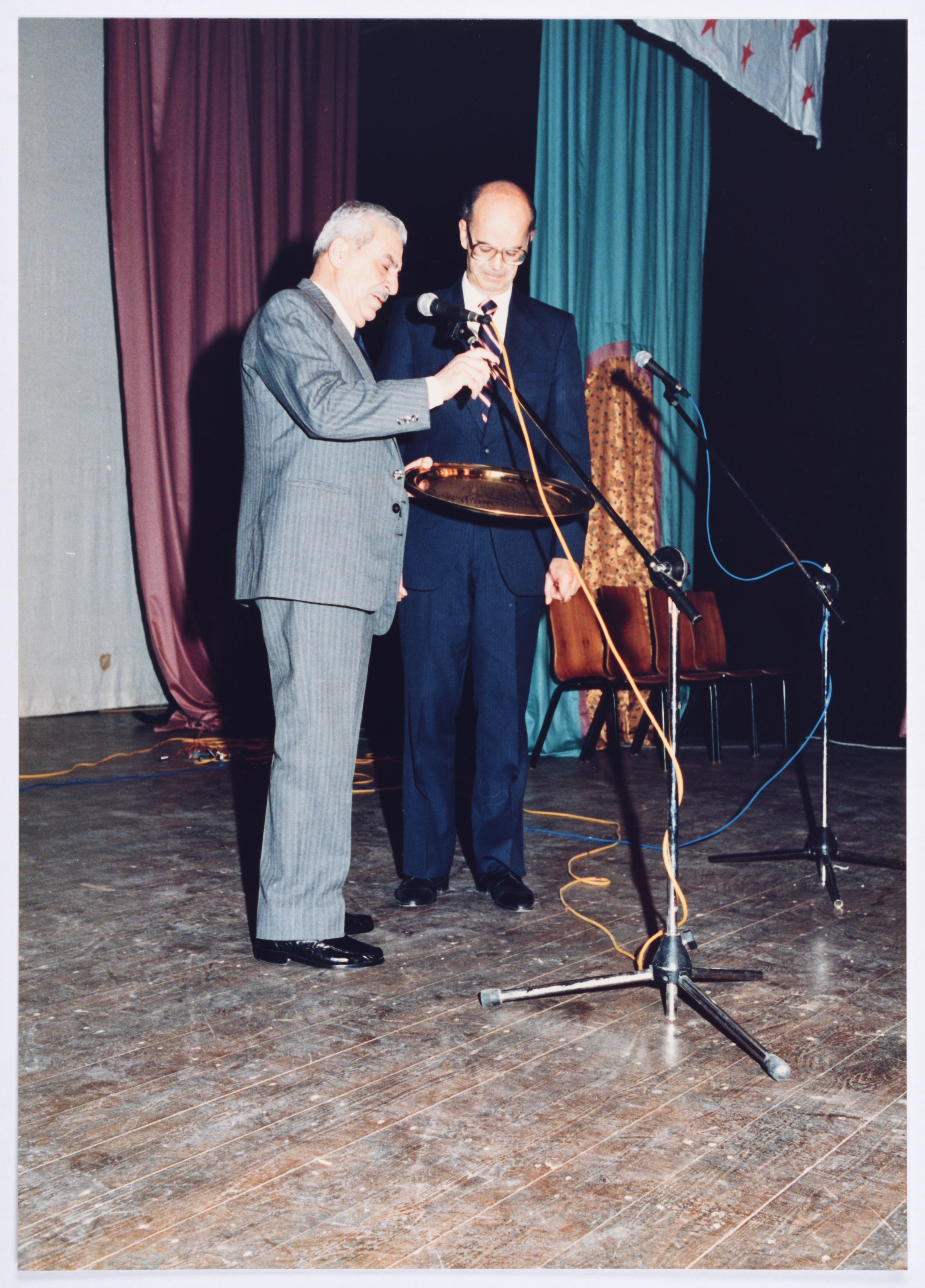 A colour photograph of the celebration at the Soroka Foundation in the 1980s, Tawfiq Ziad participated in this celebration.