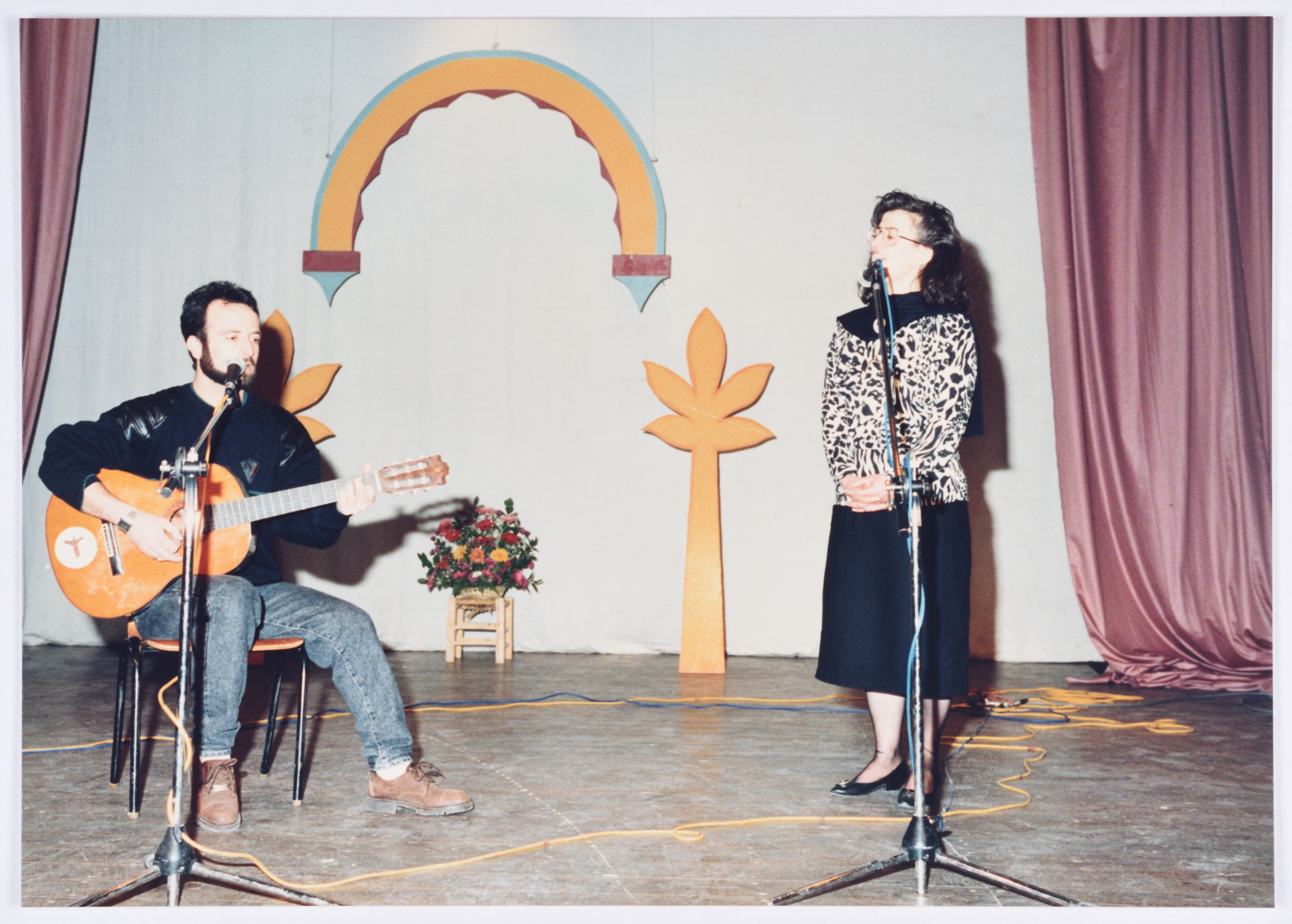 A colour photograph of the celebration at the Soroka Foundation in the 1980s, Tawfiq Ziad participated in this celebration.