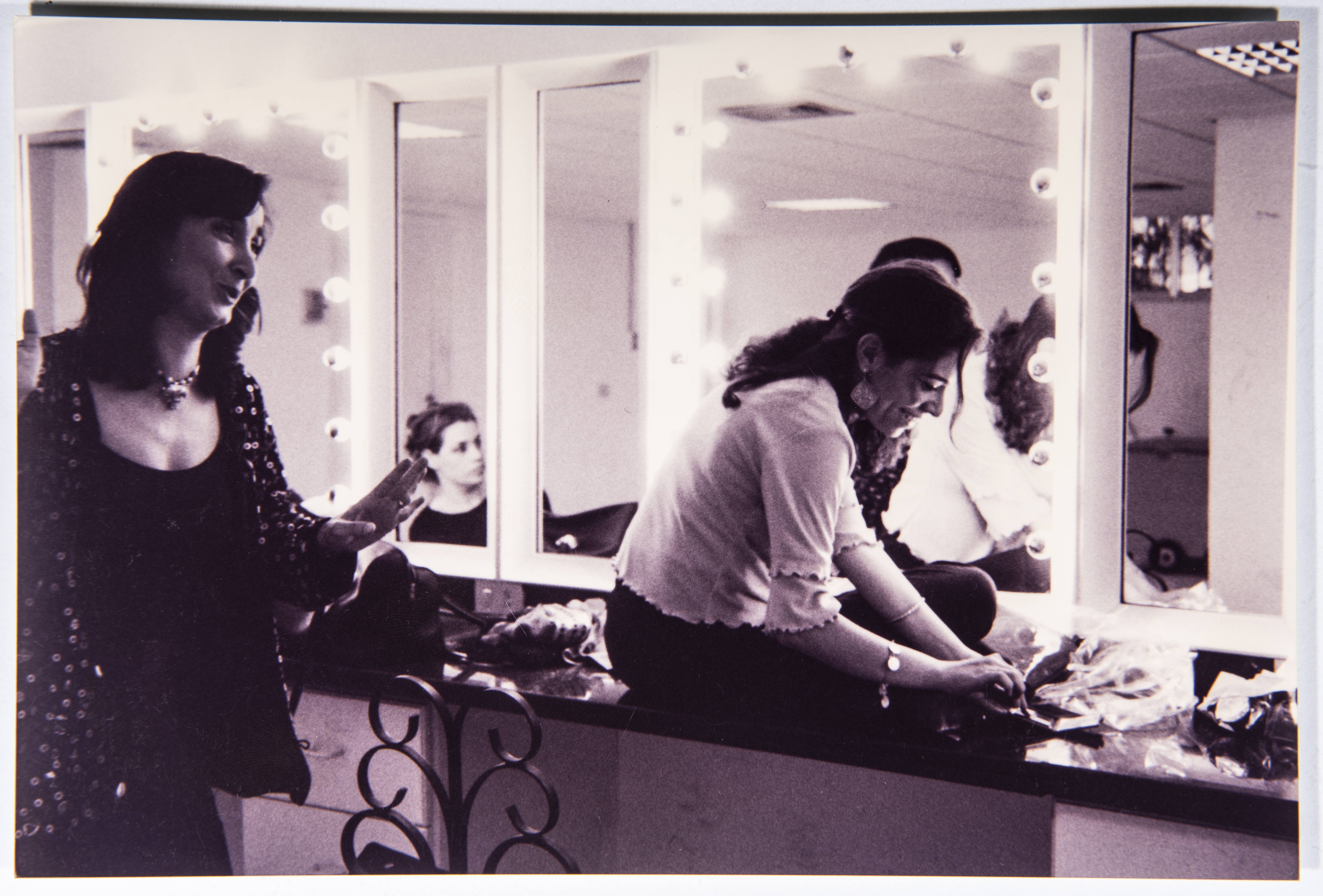 A colour photograph that captures a glimpse of el-Funoun Palestinian Popular Dance Troupe's show in Lebanon in 2000.