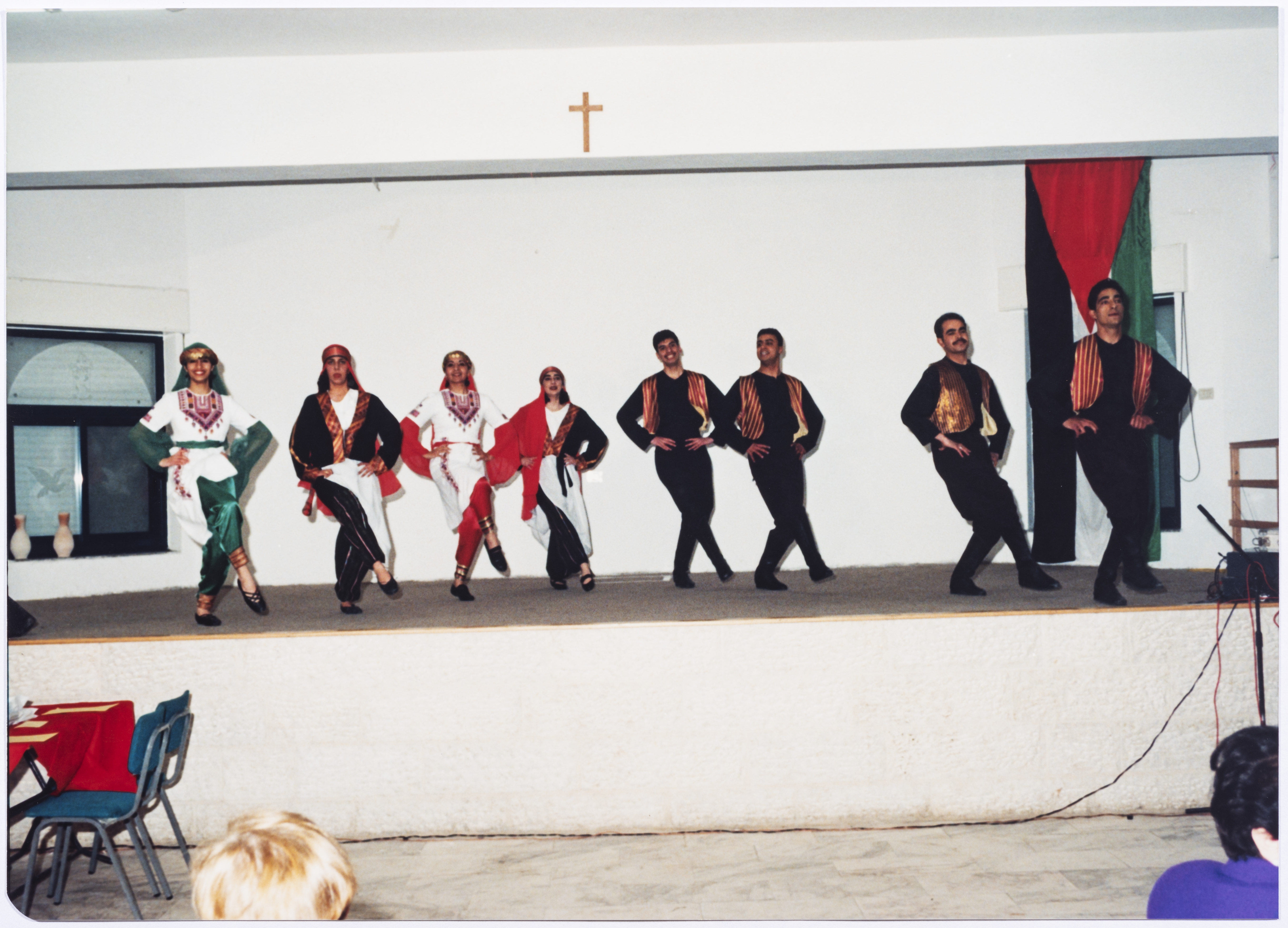 صورة ملونة من احتفال فرقة الفنون الشعبية في عيدها السابع عشر في مدينة رام الله عام 1996.