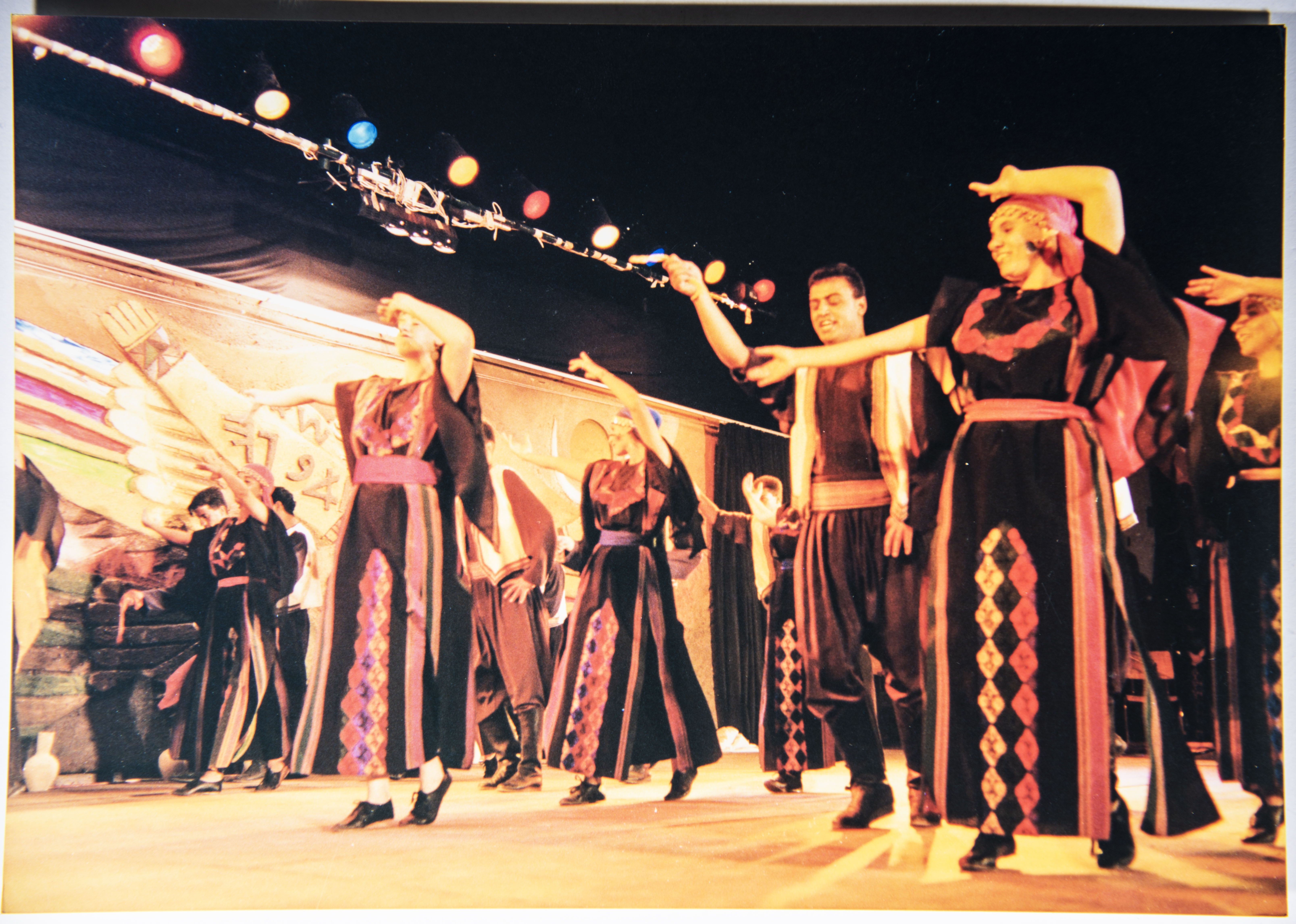 صورة ملونة ترصد ملمحًا من مشاركة فرقة الفنون الشعبيّة في مهرجان فلسطين الدولي عام 1996.