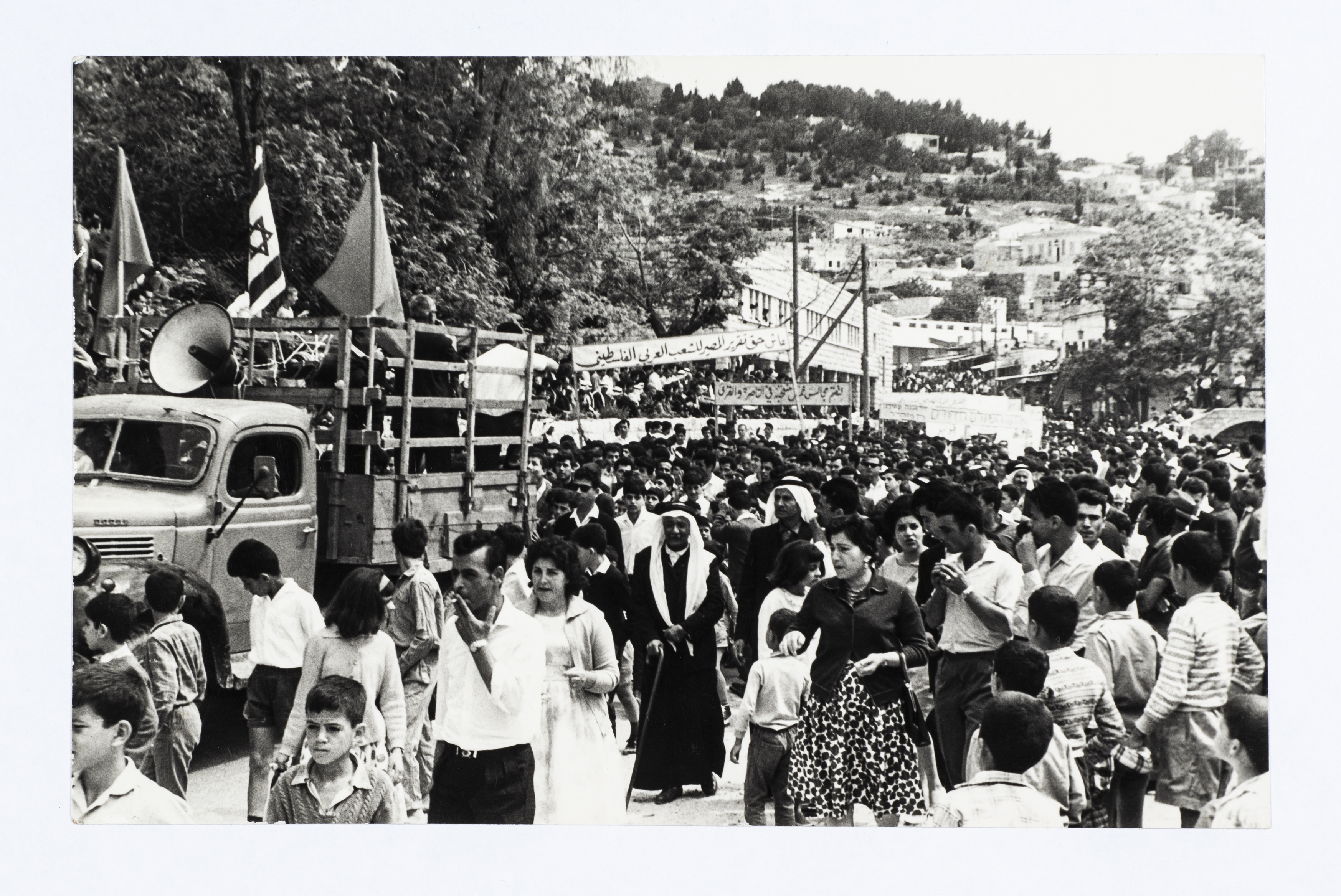 A black-and-white photograph of the demonstration of May 1 in the activities of the Israeli Communist Party in the city of Nazareth in 1976.