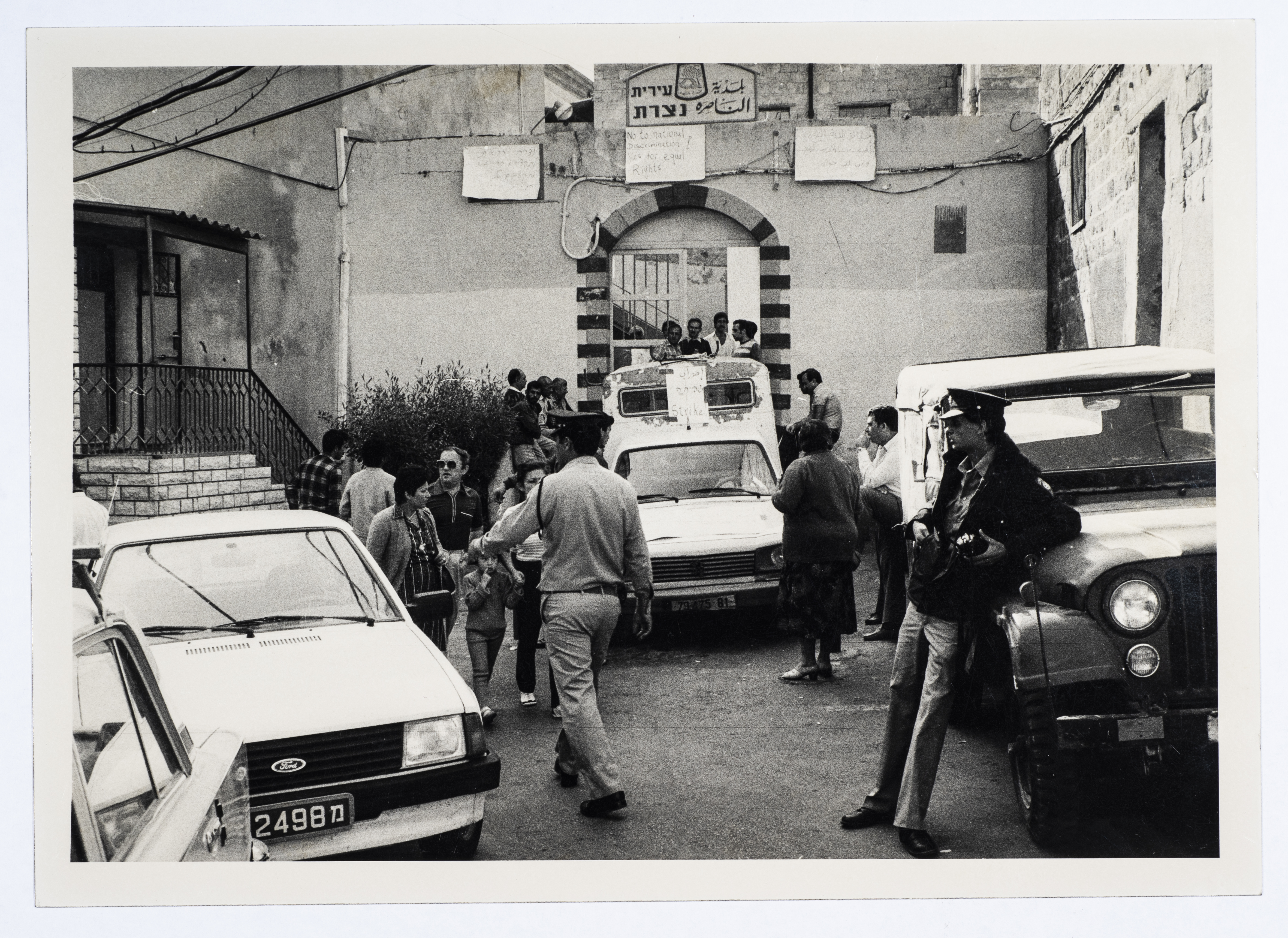 A black-and-white photograph of a sit-in in front of the Nazareth Municipality against discrimination in the occupied Palestinian home in 1948.