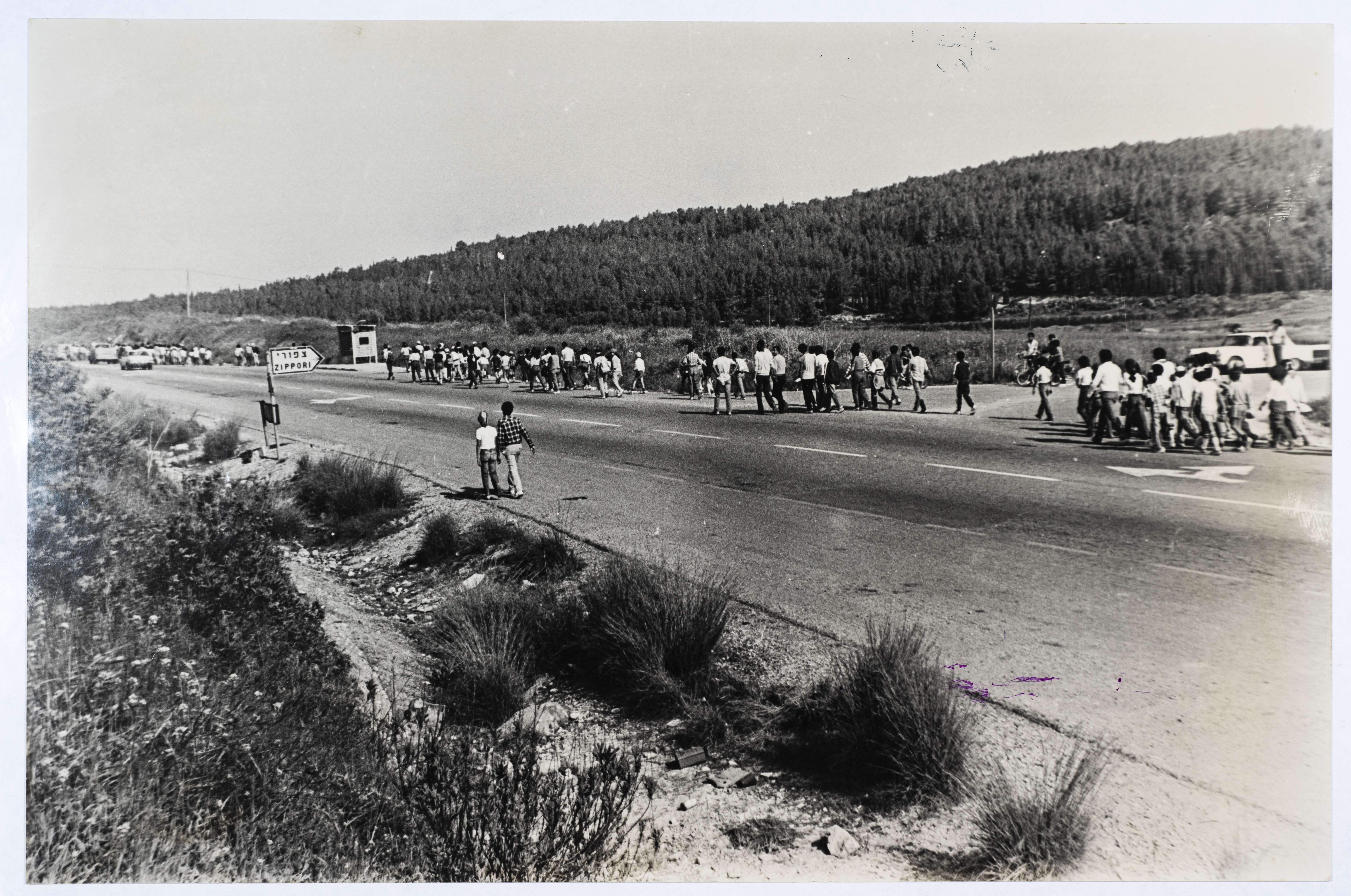 A black-and-white photograph of the march of the Nazareth clubs to the yard of Saffuriya in 1984, within the activities of the Israeli Communist Party in the city of Nazareth.