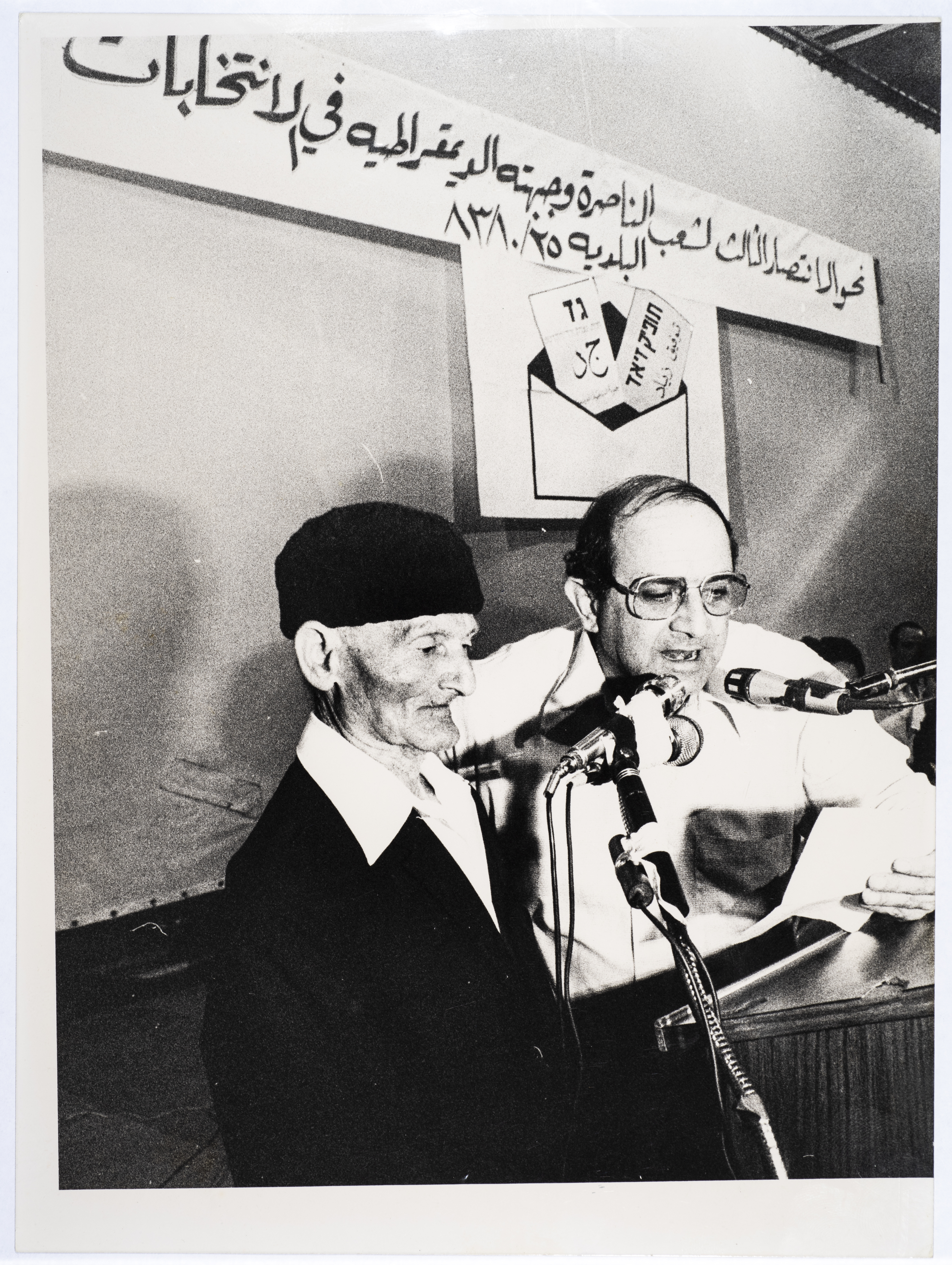 A black-and-white photograph of the festival of the Democratic Front of Nazareth during the 1983 elections.