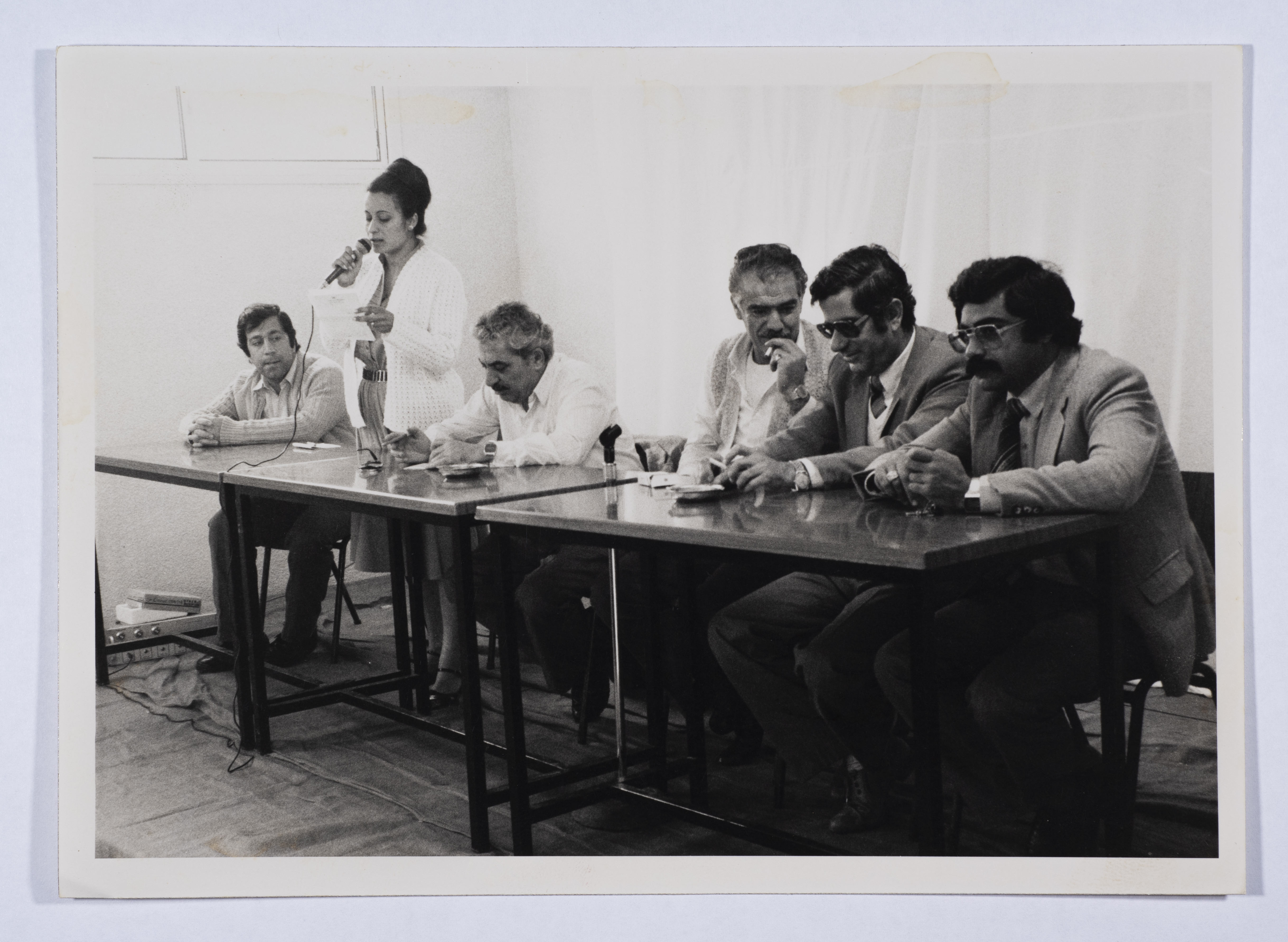 A black-and-white photograph showing Teresa Shehadeh during the speech of the workers' union in the municipality of Nazareth on Labor Day in 1984.