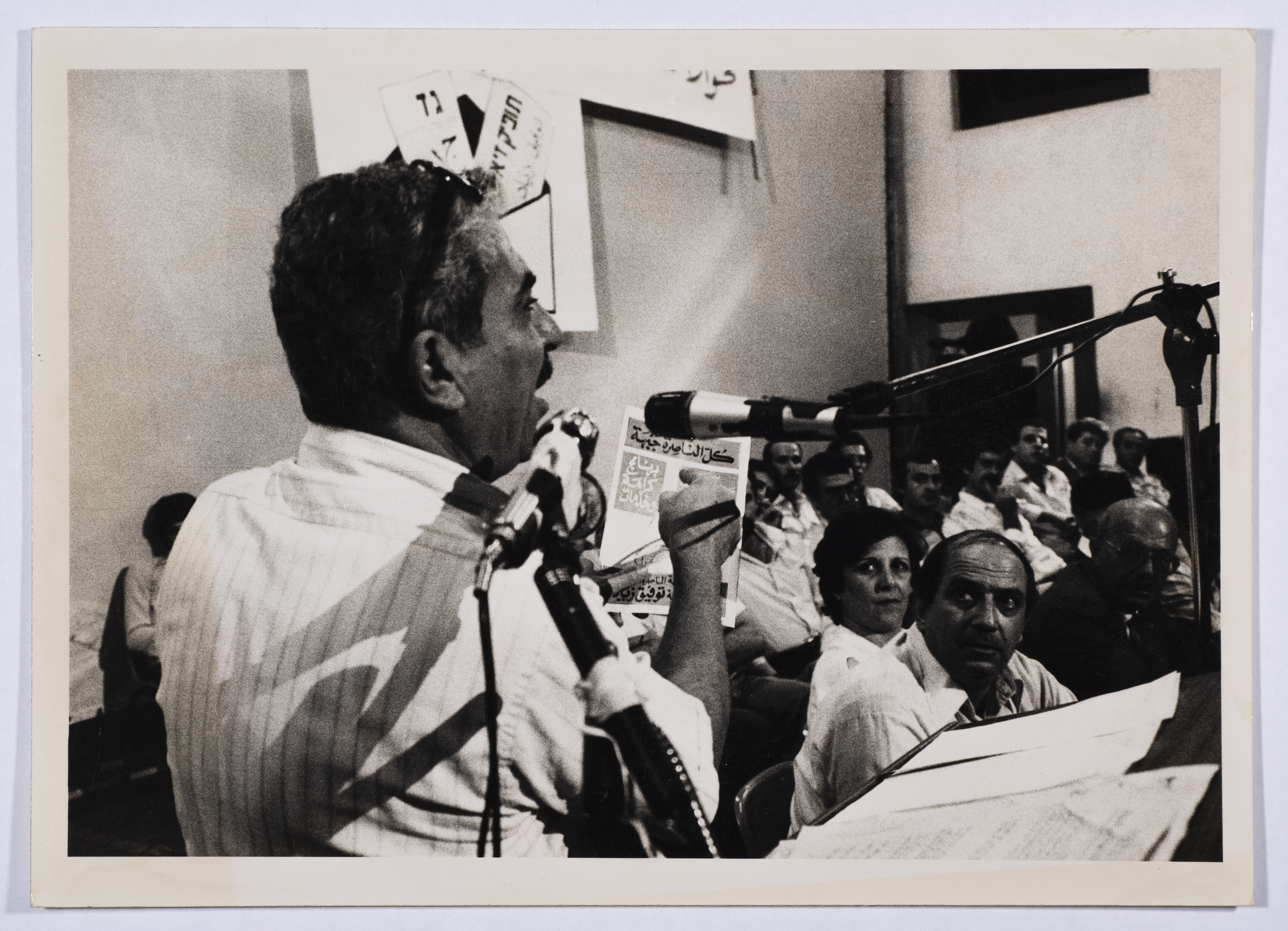 A black-and-white photograph showing Tawfiq Ziad during an election campaign for the Democratic Front of Nazareth.