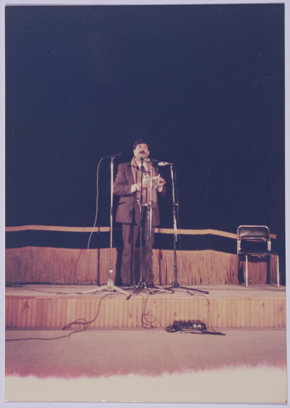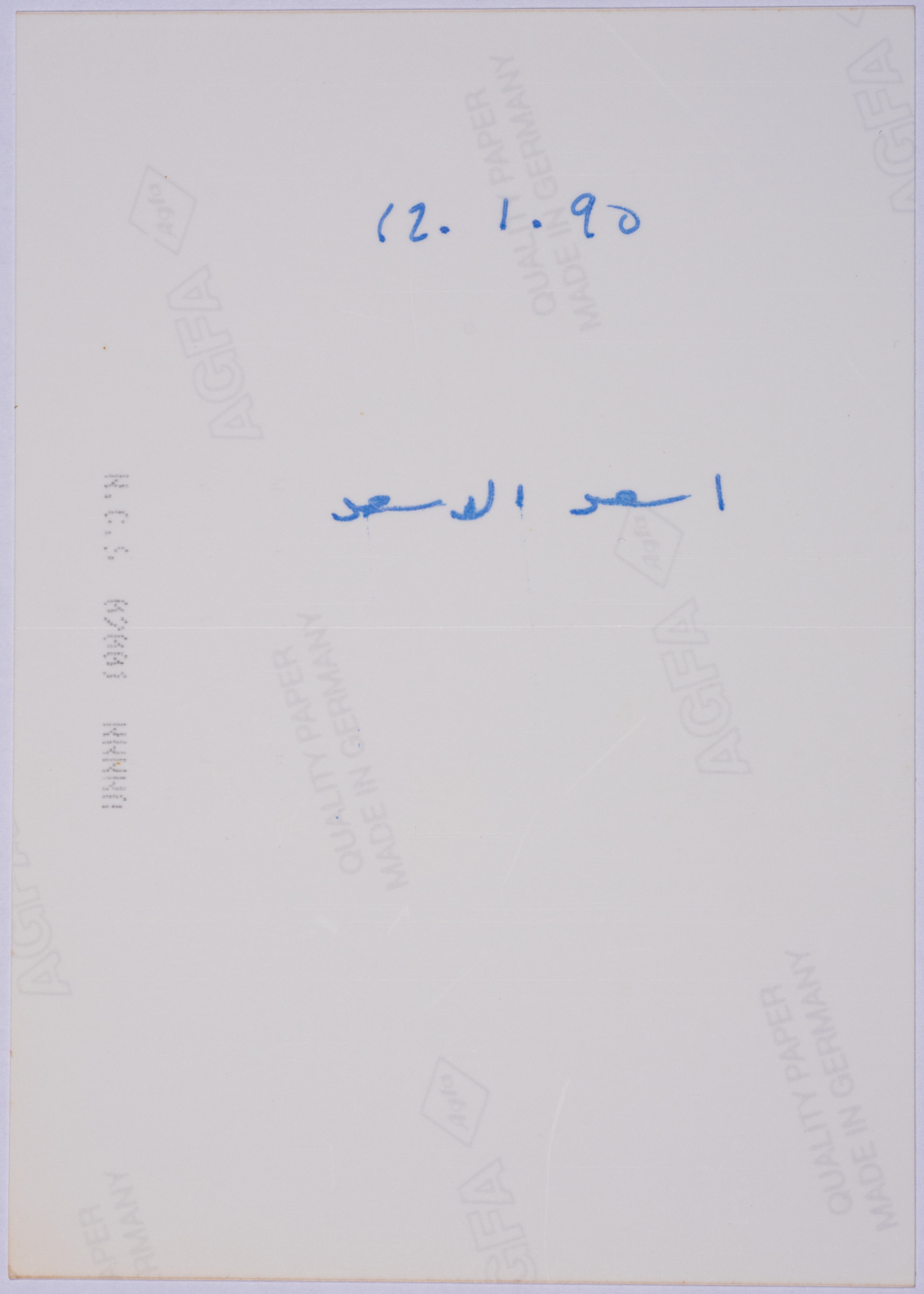 صورة ملونة من زيارة توفيق زيّاد إلى مصر عام 1990، حيث شارك في فعاليات أسبوع الثقافة الفلسطيني، يظهر في الصورة أسعد الأسعد.