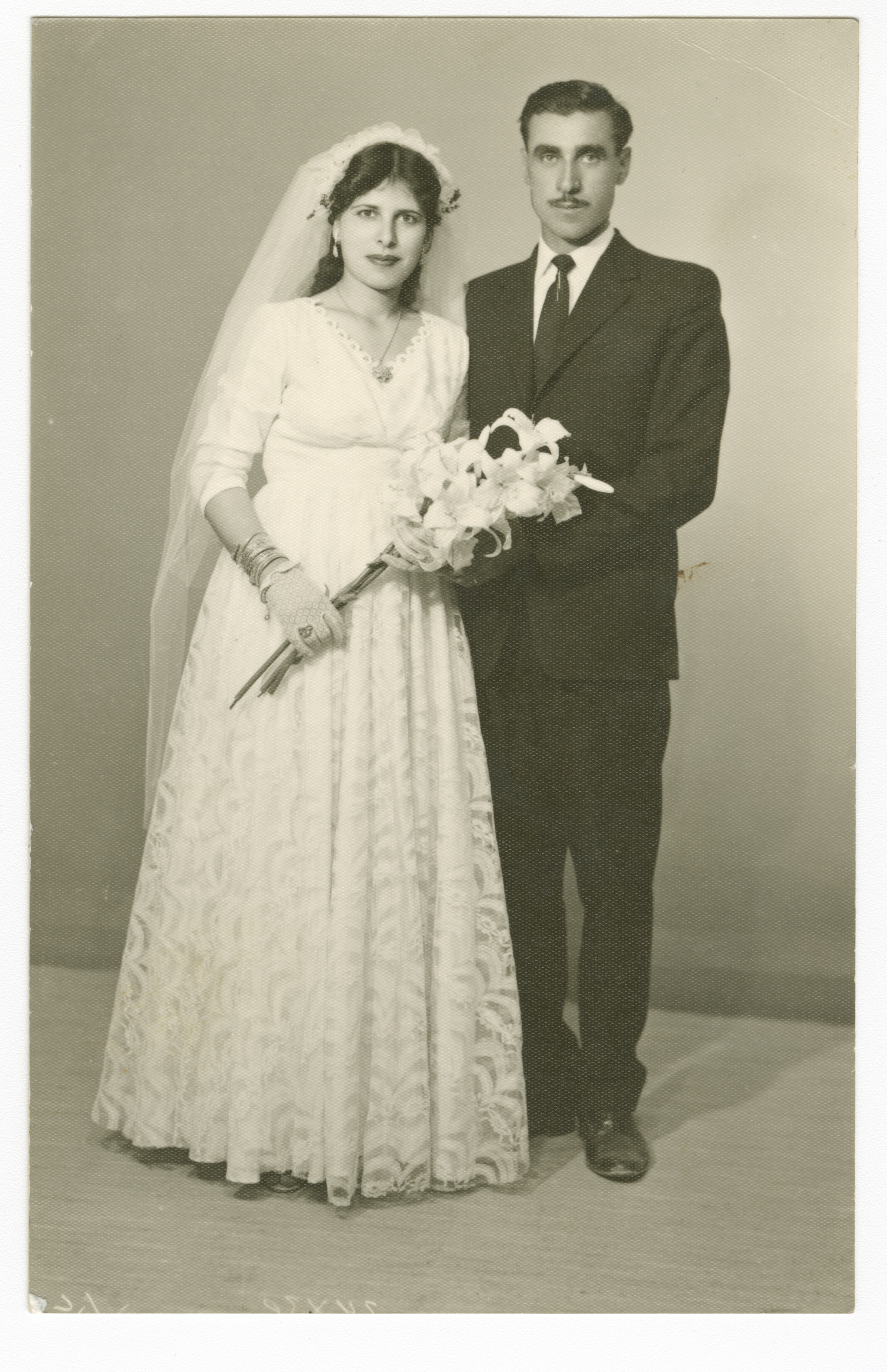 Taken in the 1960s, this photograph shows Yasser Talab Amro and his wife, Shweikar ash-Sharif, on their wedding day.