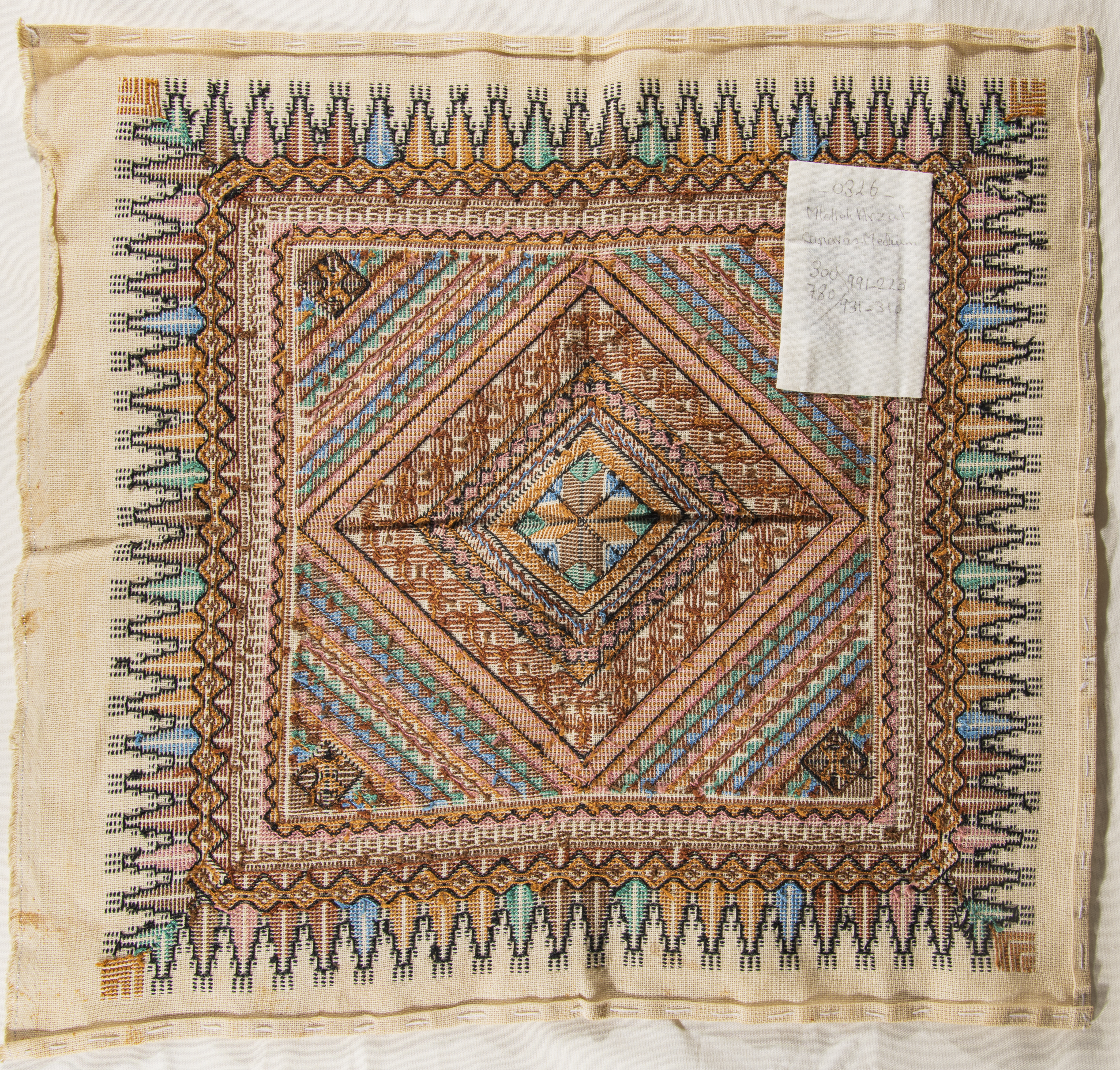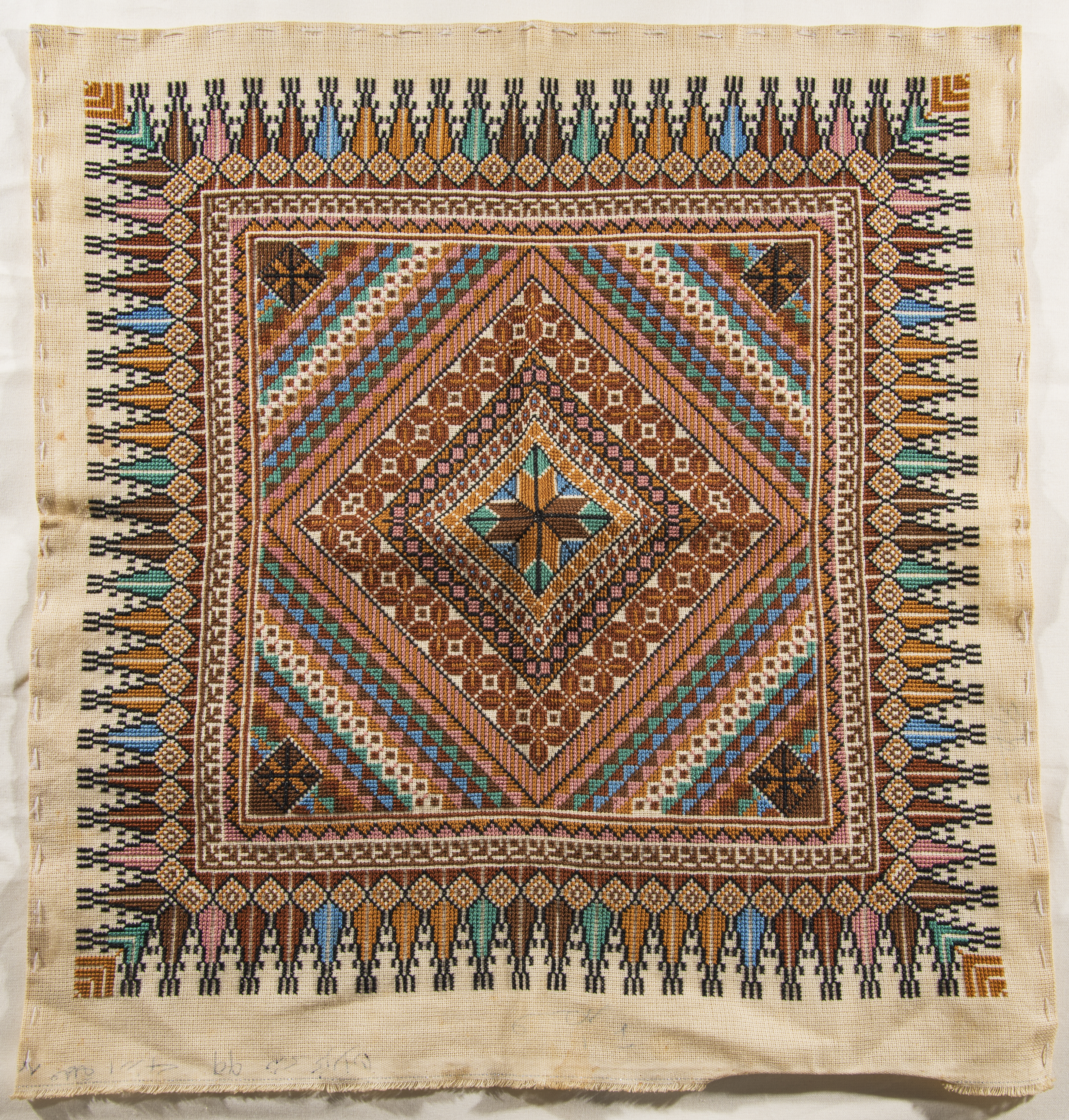This photograph shows a handmade piece embroidered by Palestinian refugee women; members of the INAASH Association for the Development of Palestinian Camps in the 1970s. Following 1968, INAASH has come to the fore at the hands of Huguette Caland el-Khoury; daughter of the Lebanese President Bechara el-Khoury, and other Lebanese women to break the isolation of the Palestinian refugee camps and empower the Palestinian refugee women to help their husbands in the face of the Lebanese law that casts a veto over the Palestinian refugees in the Lebanese labour market. At a later stage, INAASH gained the support of Sirin al-Husseiny and other Palestinian women.