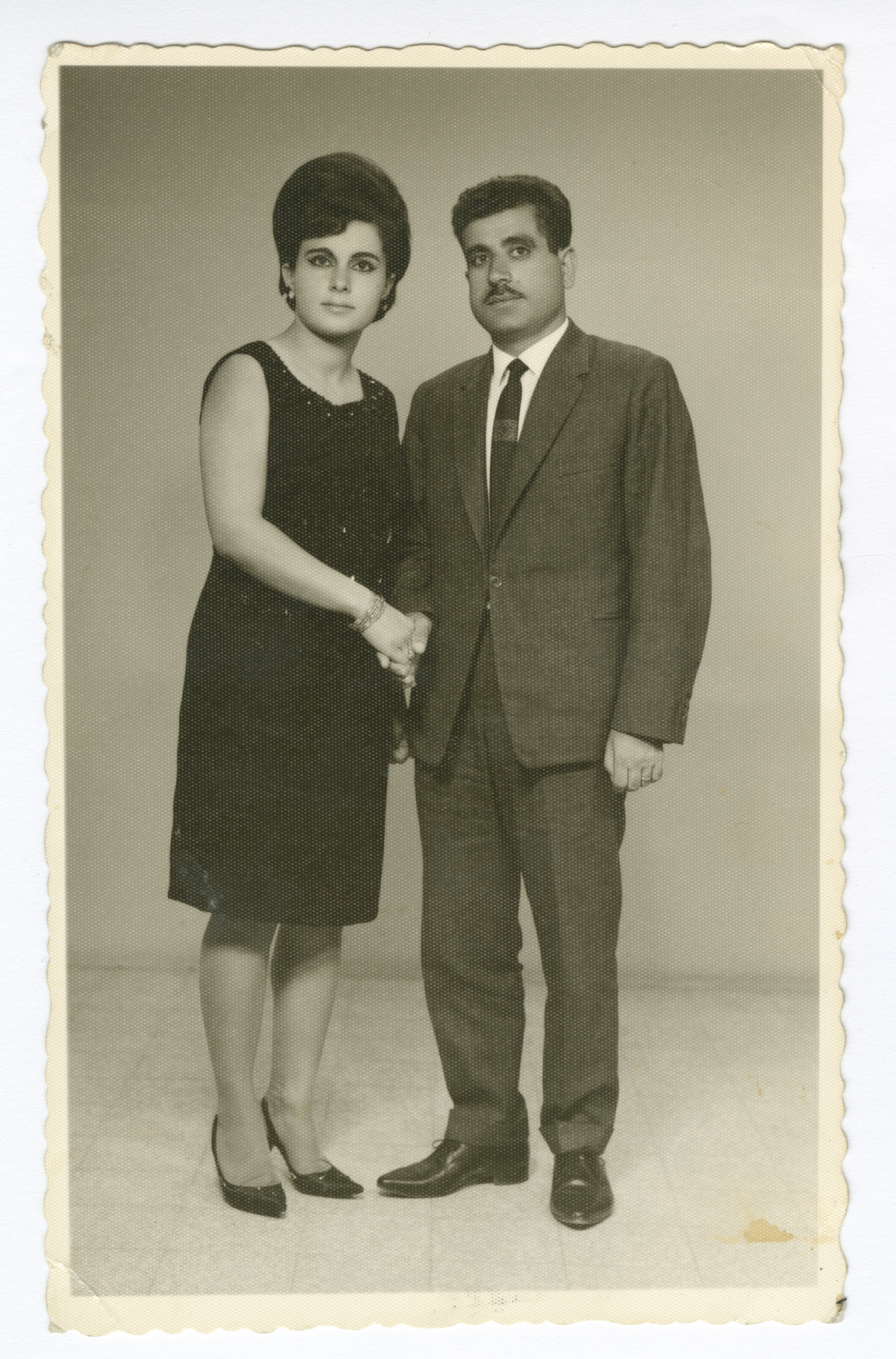 Taken in 1967, this photograph shows Fayez Sweiti and his wife, Basma Sweiti, at Kamal Studio in Amman.