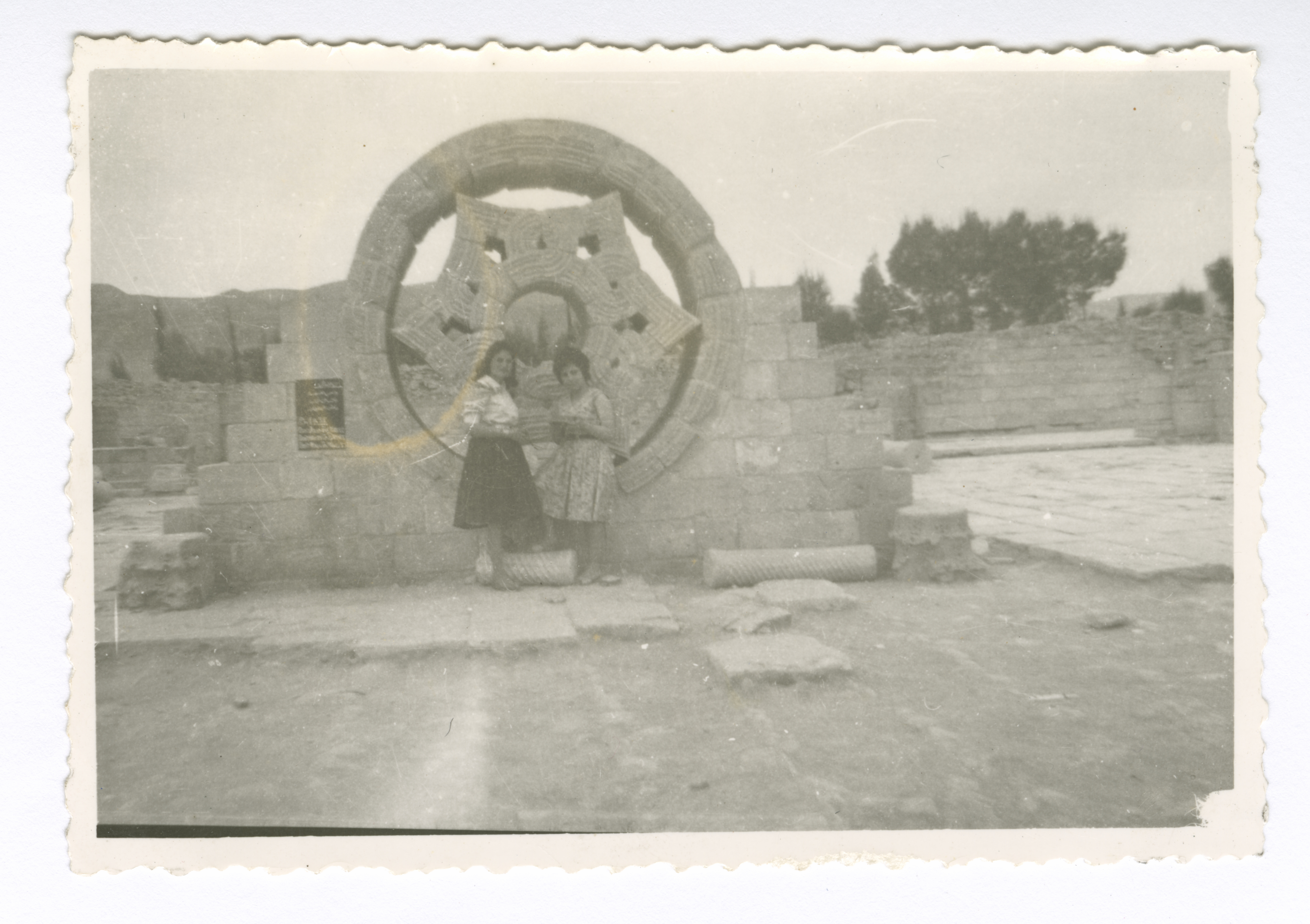 Taken during the period from 1960 to 1965, this photograph shows Layla Sweiti and her friend in front of Hisham's Palace in Jericho.