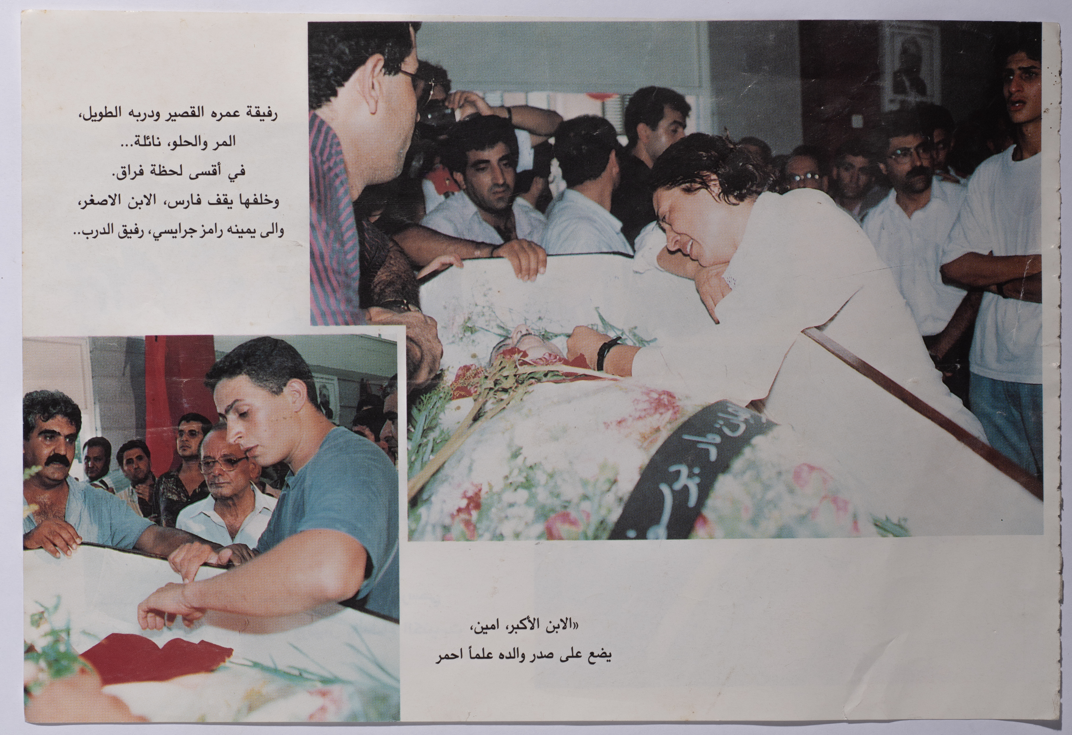 A clip from a newspaper containing photos of Tawfiq Ziad's funeral in 1994.