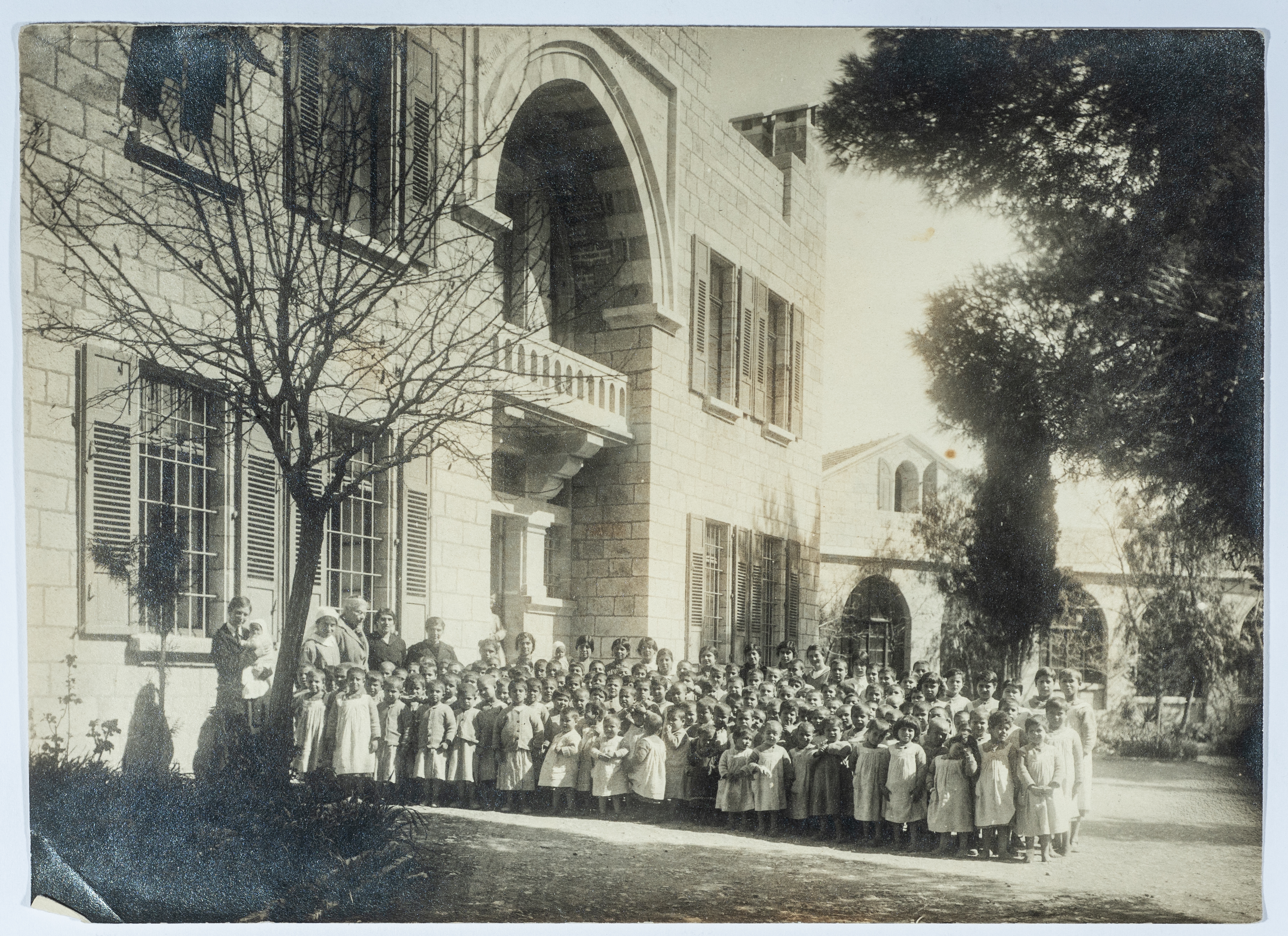 صورة غير ملونة يظهر فيها مجموعة أطفال في ساحة أحد المباني في القدس، وُجدت في مجموعة مدارس الفرندز .