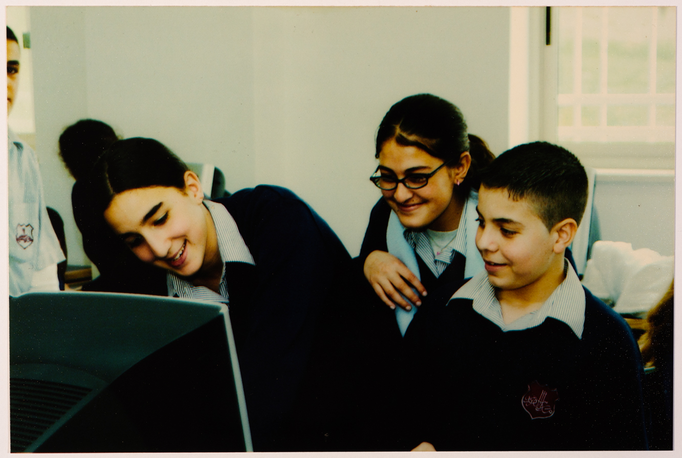 صورة ملونة يظهر فيها مجموعة طلبة من مدرسة الفرندز يسخدمون جهاز حاسوب، وُجِدت الصورة في مجموعة مدرسة الفرندز.